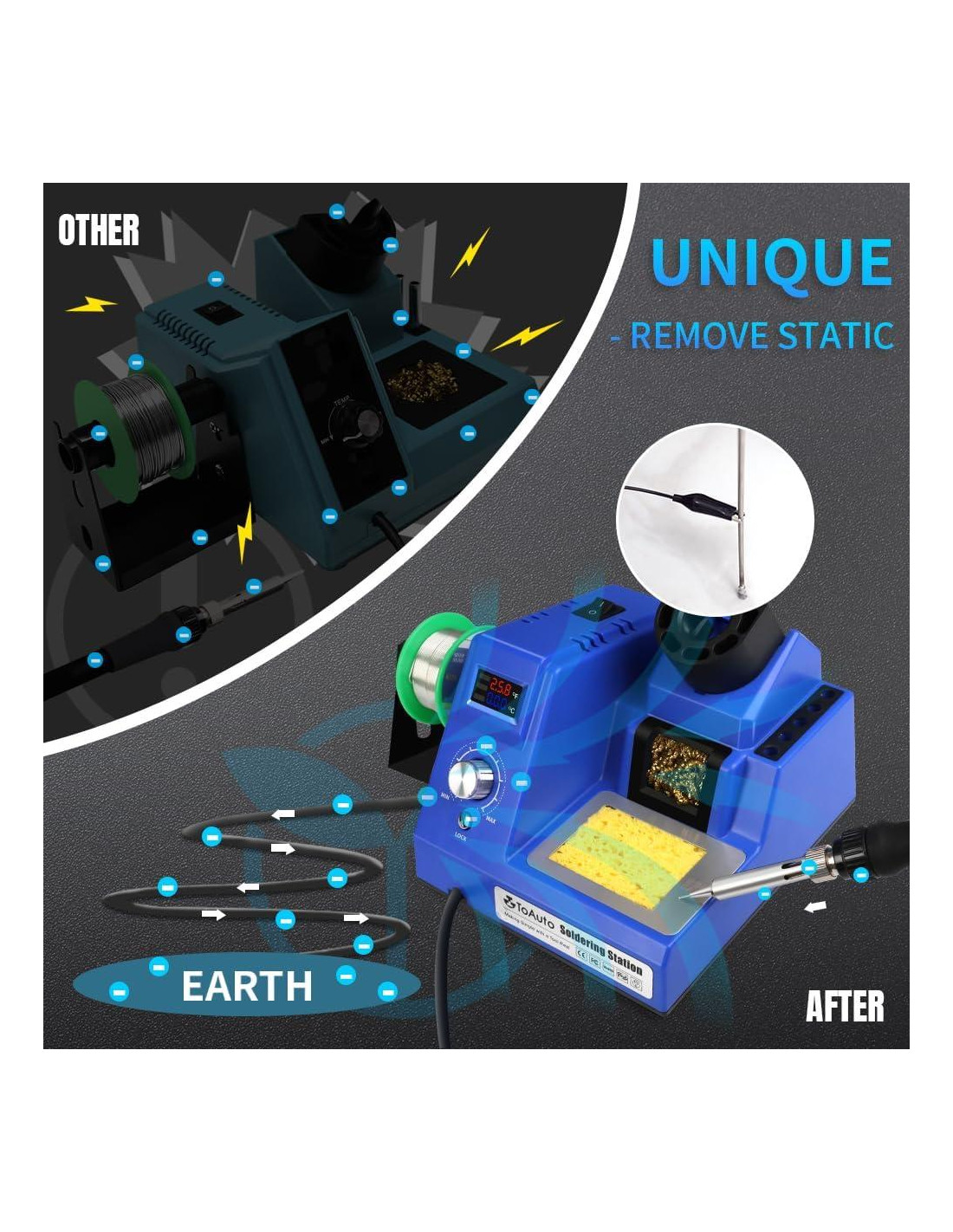 - [VERSIÓN MEJORADA-DISEÑO NUEVO PARA ELIMINAR ESTÁTICA & PANTALLA DIGITAL DOBLE] Mejorado a la NUEVA Versión Azul DS-90W para pedidos después del 7 de marzo de 2022. La estación de soldadura TOAUTO DS90 tiene un diseño de cable de tierra ÚNICO PATENTADO y una hoja para eliminar estática, permitiéndote concentrarte en desoldar de manera segura. Agregando función de pantalla digital dual F / C, y el modo de selección de diseño de doble fila de color LED es más intuitivo, ya no te confundirás con los números.