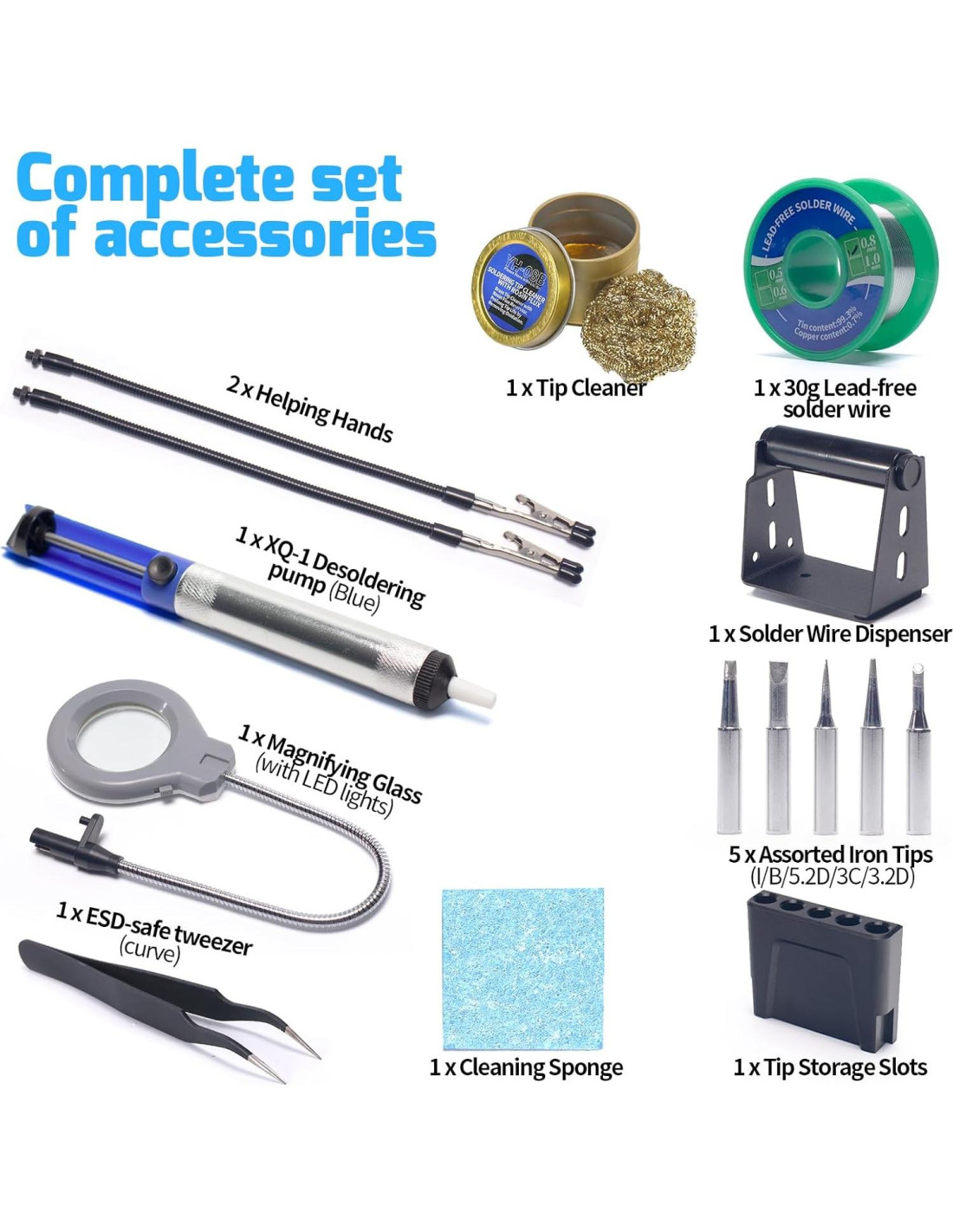 - Componentes incluidos: Cuerpo de la Estación de Soldadura; Hierro; Alambre de Soldadura; Puntas; Bomba de Desoldadura; Pinzas; Limpiador de Punta de Lana de Bronce con Flux de Resina; Esponja de Limpieza; Manos Ayudantes; Lámparas LED de Aumento; Bloque de Almacenamiento