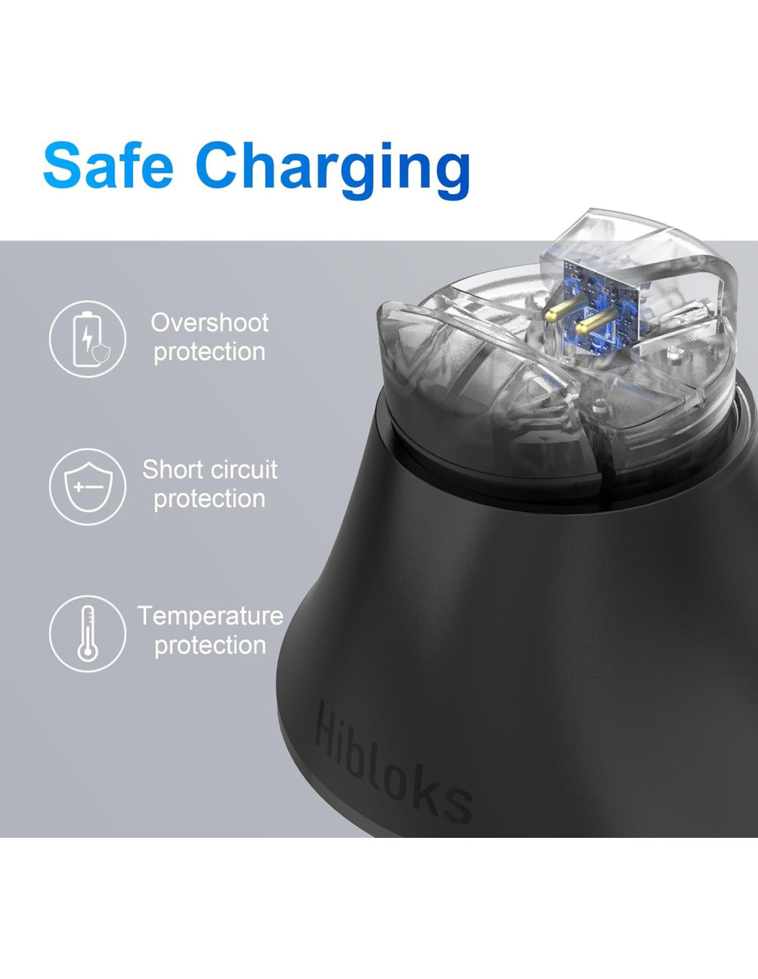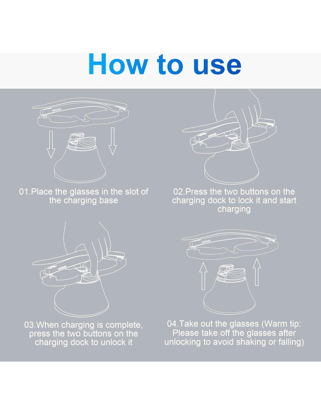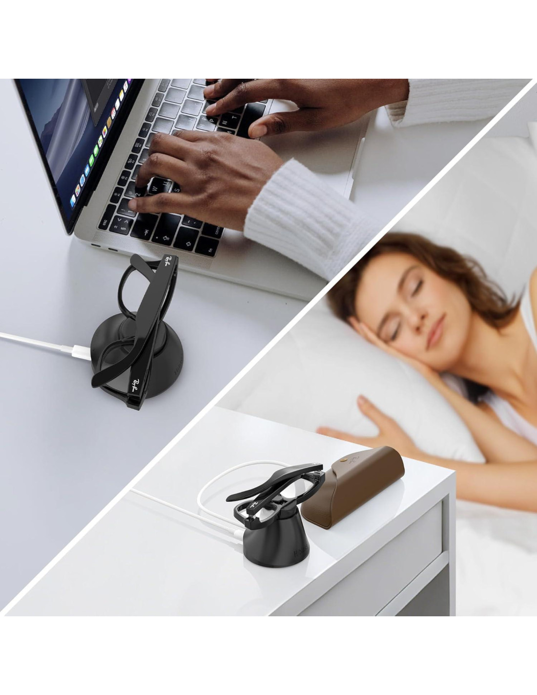 - Operación con Una Mano: Simplemente quita las gafas y colócalas en la base de carga, luego presiona suavemente con dos dedos para cargar sin problemas. Tiene un sistema de luz LED claro (rojo para cargar, verde para completamente cargado), por lo que puedes monitorear fácilmente el progreso de carga ya sea de día o de noche