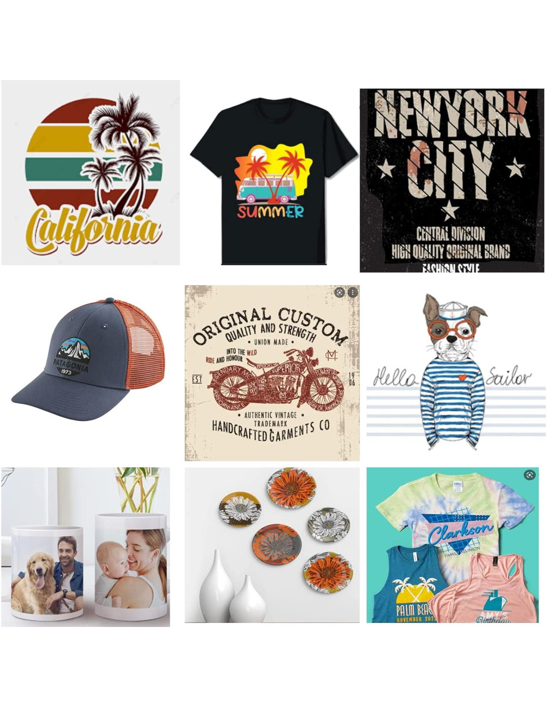 - Usos recomendados para el producto: Camiseta, Gorra, Taza, Plato, Gorro