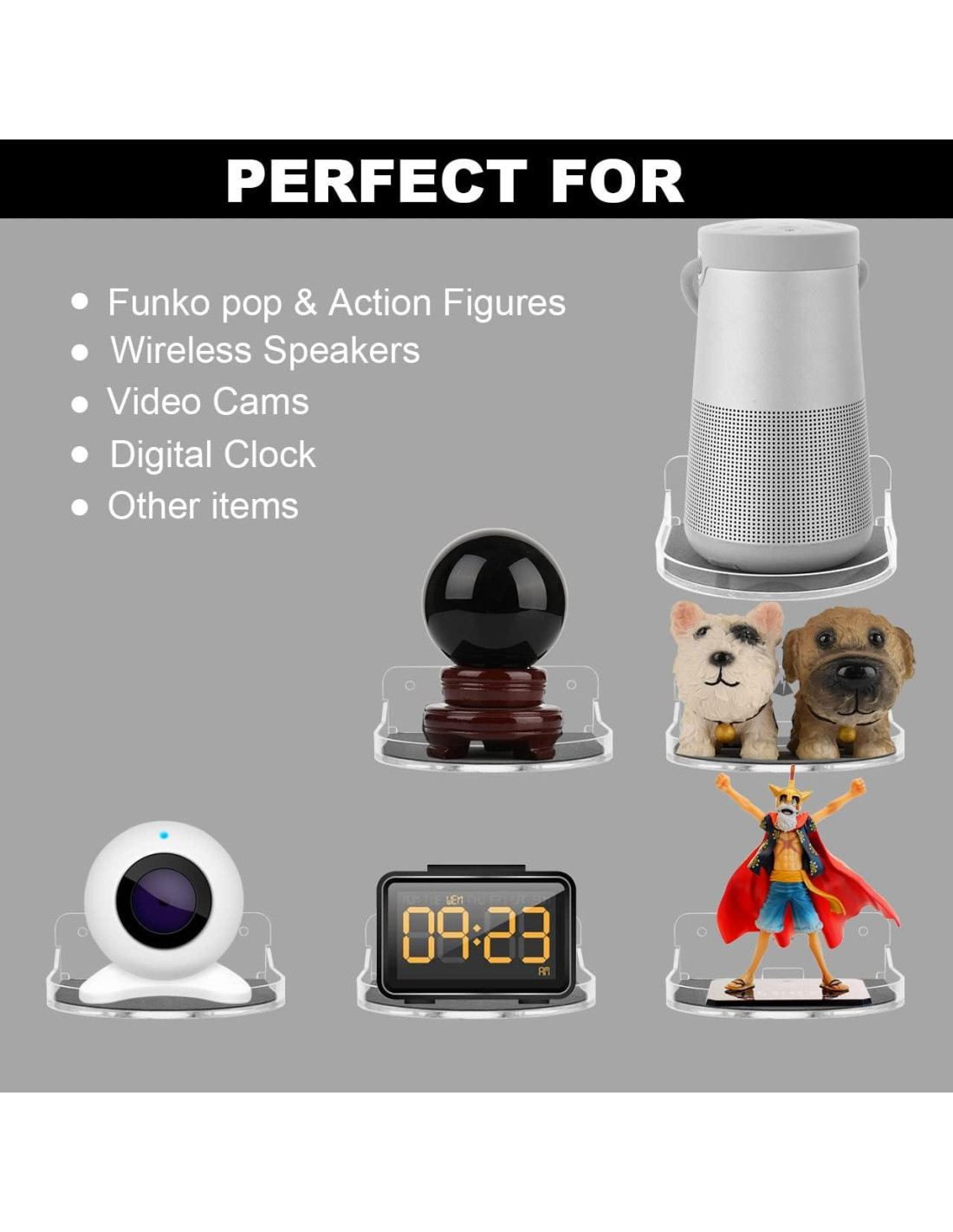 - Tamaño: 5X4.75 pulgadas (12.7X12.1 cm). Perfecto soporte de exhibición en la pared para Altavoz, Webcam, Teléfonos Móviles, Enrutador de Malla y colecciones de Artes, etc. Transforma el espacio desperdiciado en la pared en un área de almacenamiento espaciosa.