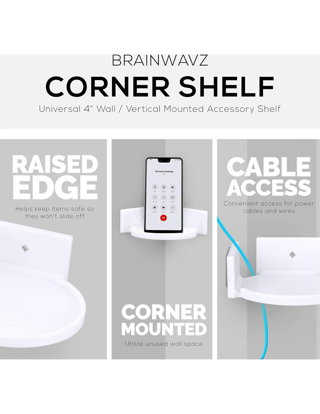 Ideal para usar con tu monitor de bebé, cámara de seguridad, enrutador WiFi y sistema Mesh, altavoces pequeños, plantas, libros y más. Acceso integrado para cables USB / de alimentación permite que los cables y cargadores pasen fácilmente a través del estante para su uso con pequeños dispositivos electrónicos como altavoces inteligentes, cámaras y mucho más. Aprovecha el espacio vacío con nuestros simples estantes flotantes, almacenamiento montado en la pared conveniente, con bordes elevados para esa pequeña seguridad adicional. ADECUADO PERO NO LIMITADO A: Monitores de bebé, cámaras de seguridad, enrutadores WiFi y sistemas Mesh, altavoces pequeños, plantas, libros, coleccionables, teléfonos, cepillos de dientes, desinfectantes de manos y mucho más. LO QUE INCLUYE: 1 x Estante de Esquina de 4" | Cinta 3M VHB | Tornillos | Tapones de Pared | Tapas de Tornillo