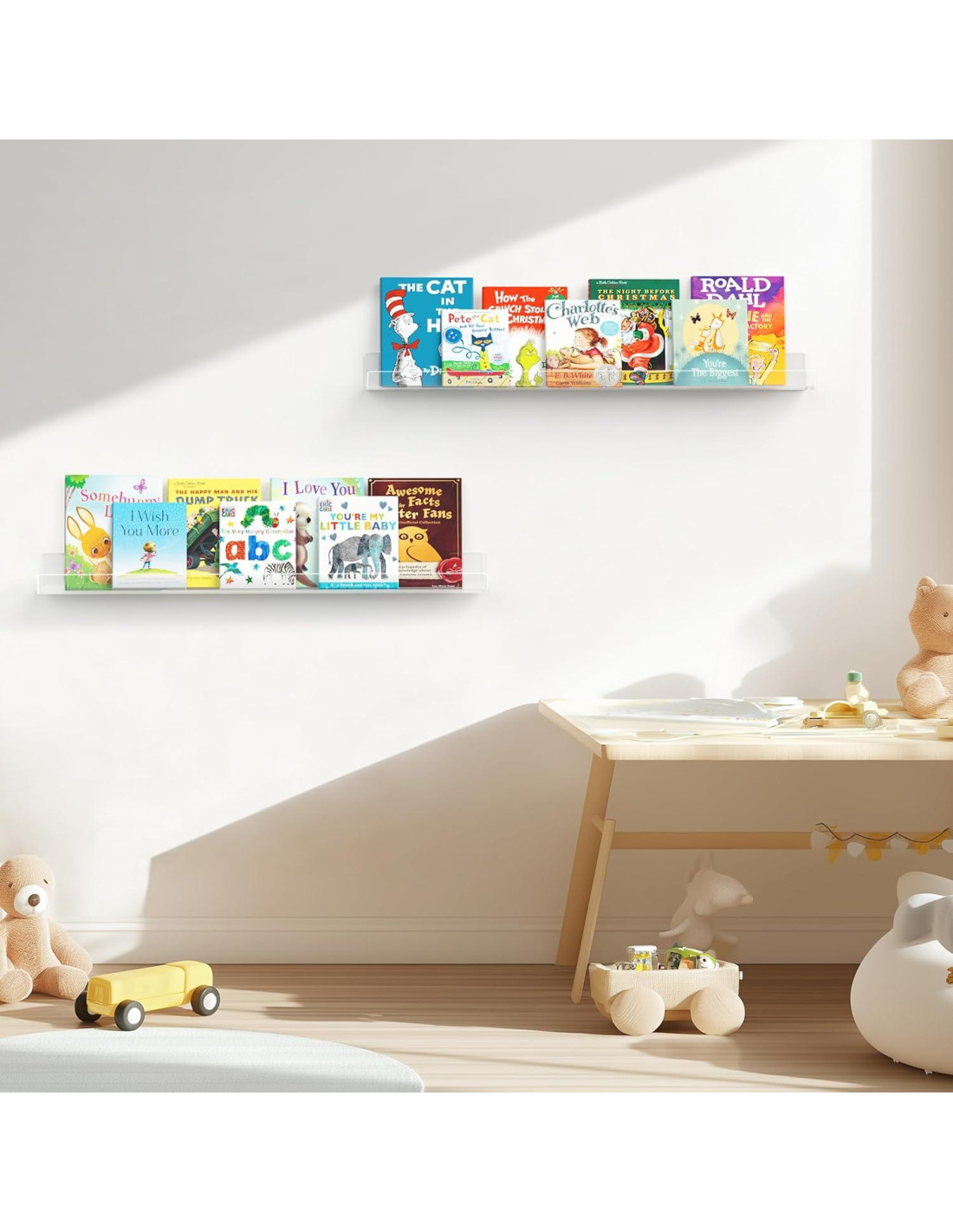 - Estantes de Exhibición Bonitos: Nuestros estantes de pared para niños son neutros y no entrarán en conflicto con otras decoraciones. Dan la ilusión de objetos flotantes y no obstruyen la vista a través de la ventana.