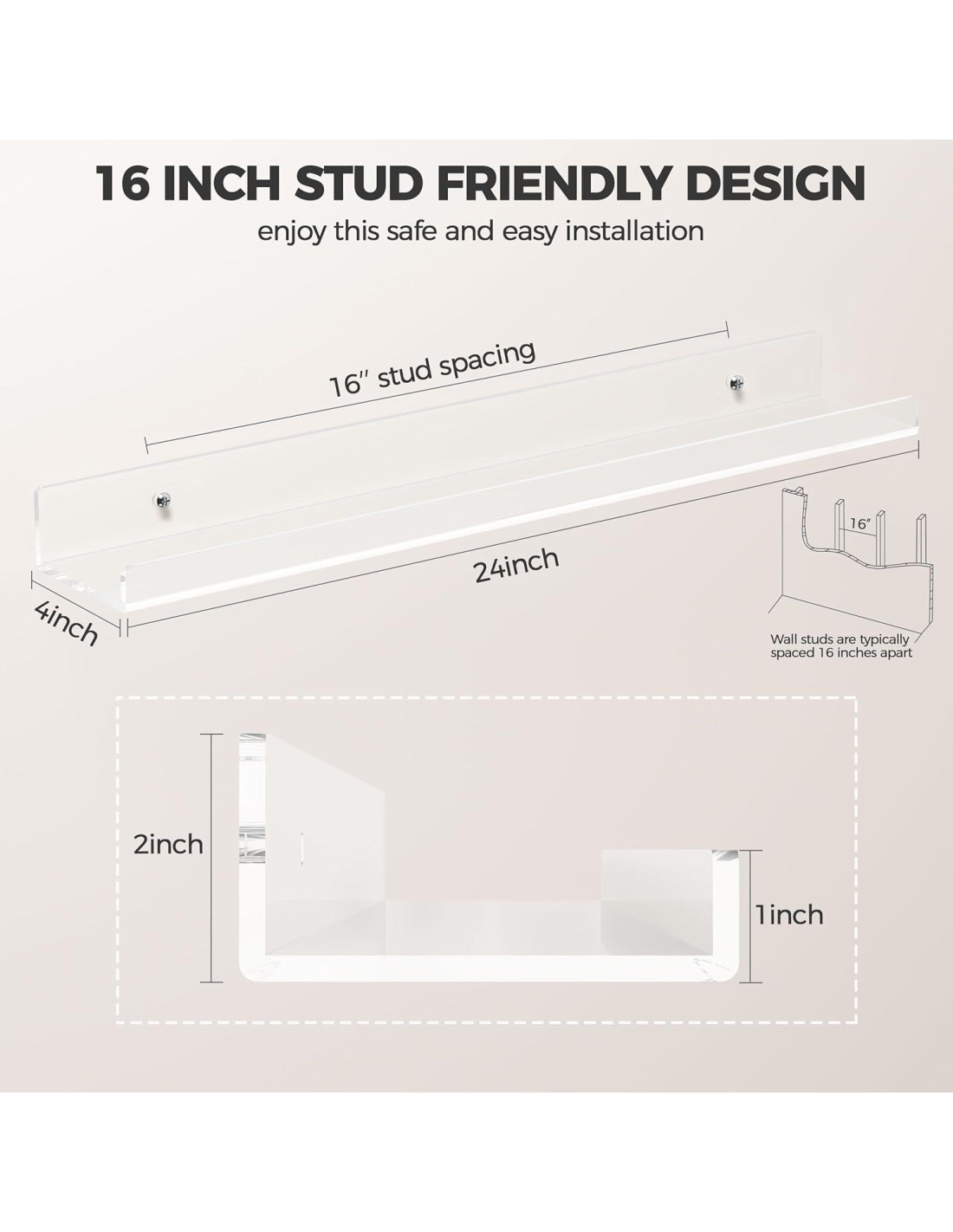 - Diseño de Espaciado de 16 Pulgadas entre Soportes: Su orificio de montaje está diseñado a 40.64 centímetros de distancia para una instalación segura en los montantes de la pared, permitiendo que el estante se monte de manera segura en la pared con mayor capacidad de carga. Fácil de Instalar, incluso los bordes están pulidos y vienen con los accesorios requeridos.