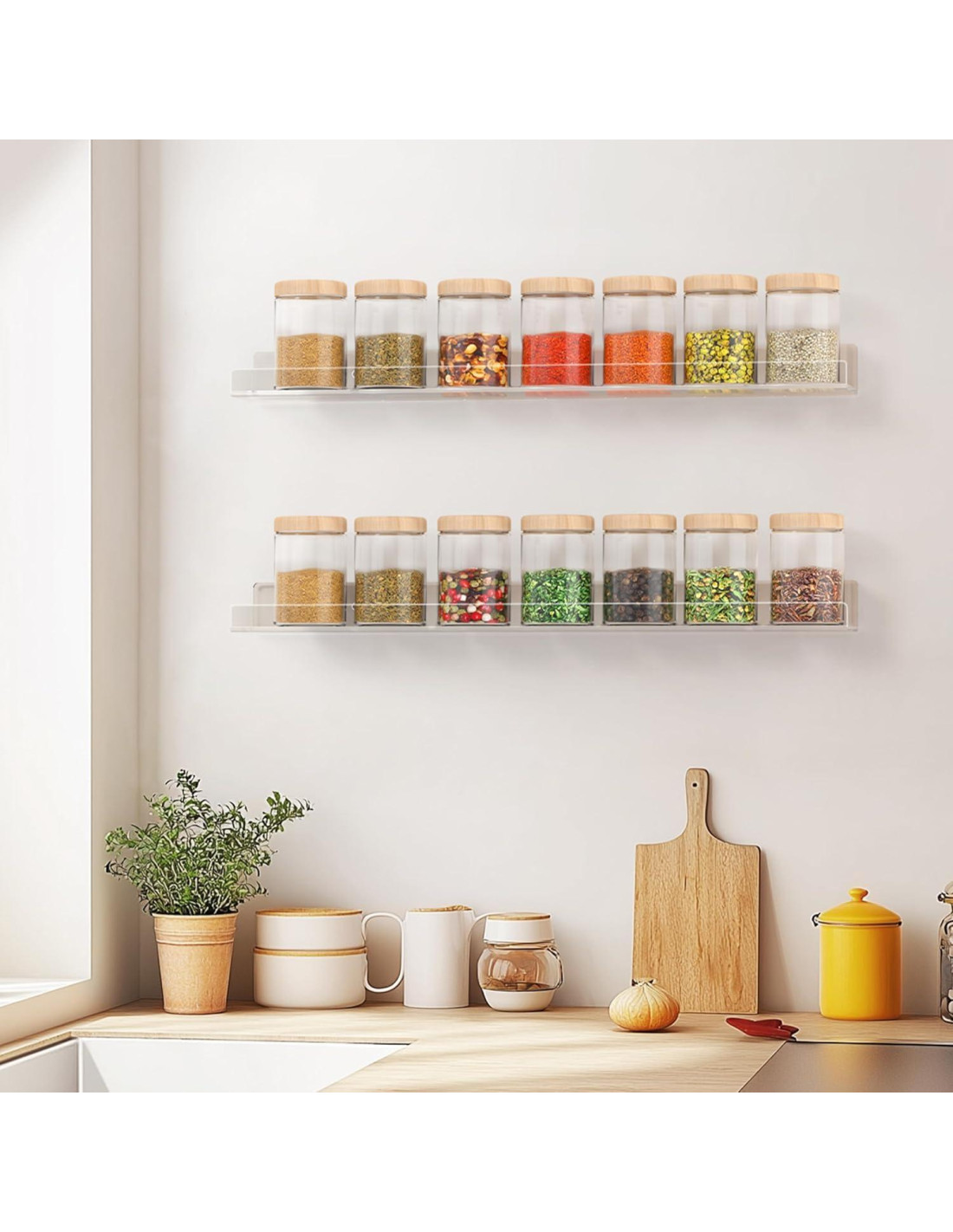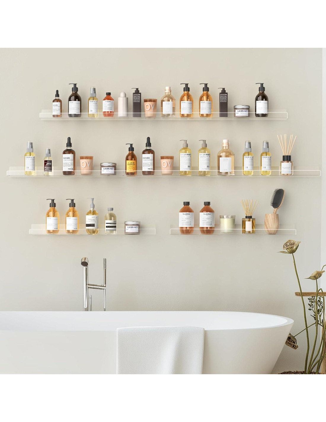 - Uso Multipropósito: Nuestros estantes son ideales para coleccionistas de figuras, y también se pueden usar para colocar maquillaje, especias, artículos de tocador. El borde frontal de 2.54 centímetros es suficiente para evitar que los objetos se caigan. Además de en paredes de guarderías, se utilizan popularmente en baños, dormitorios, cocinas y tiendas.