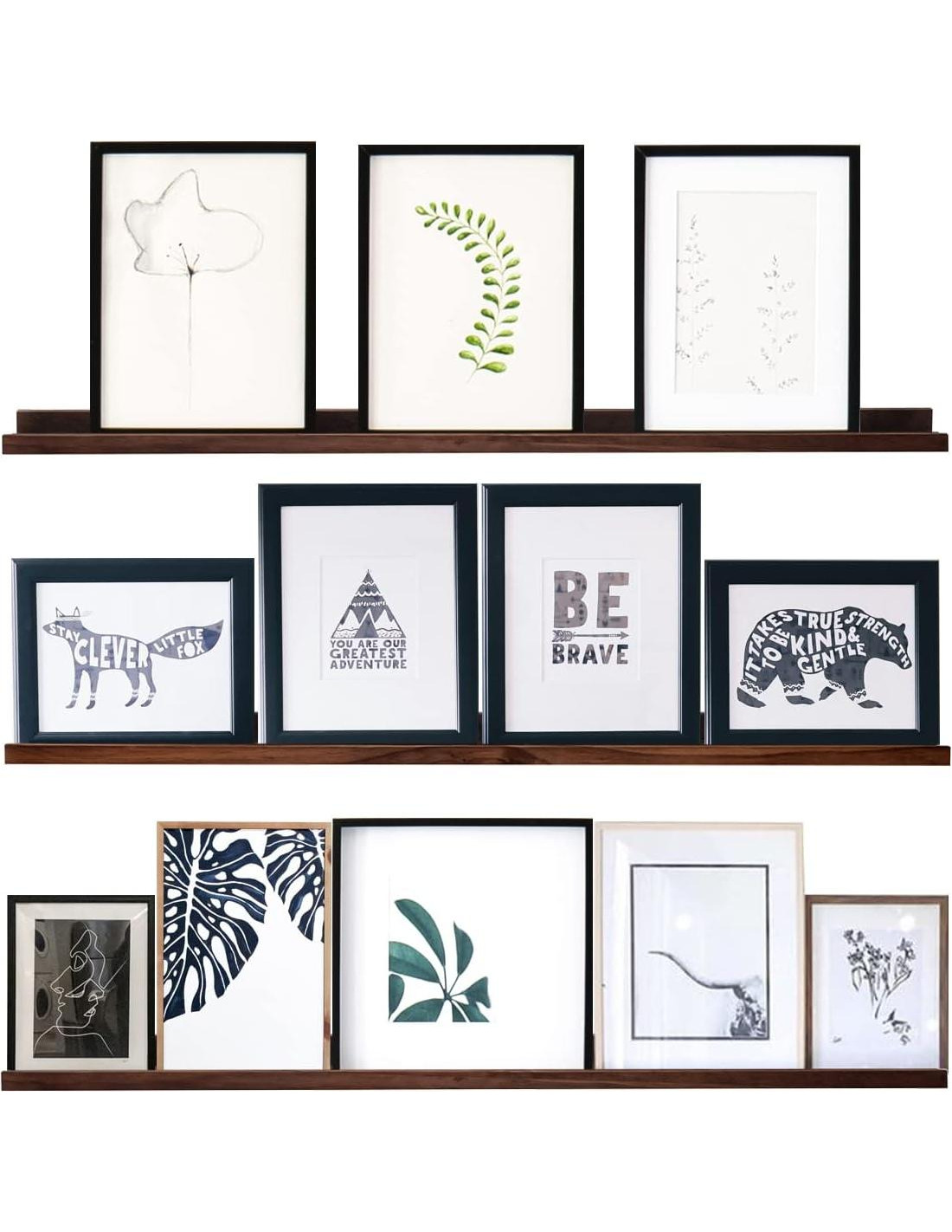 - Estante de Pared Premium: El tamaño de los estantes para fotos es 48 in x 3.7 in x 1.6 in. Hecho de 100% madera sólida y hecho a mano, por lo que estas estanterías flotantes son duraderas. Perfecto para exhibir plantas en macetas, fotos familiares, coleccionables, etc. Sin embargo, el color de la madera puede variar ligeramente debido al ligero peso del proceso de quema de la madera.