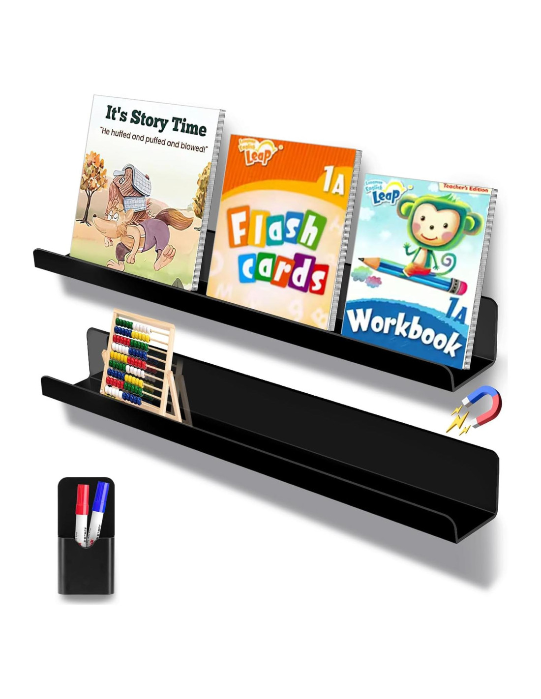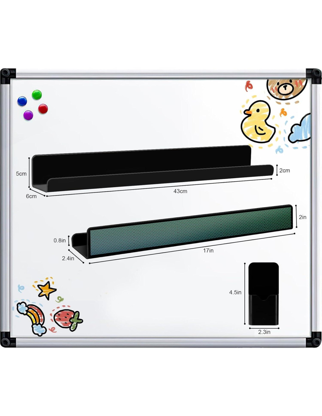 - Artículos y tamaños: Cada paquete contiene 2 estantes magnéticos. Dimensiones: 43 cm L x 5.8 cm W x 5.1 cm H. También contiene una caja de lápices magnética.