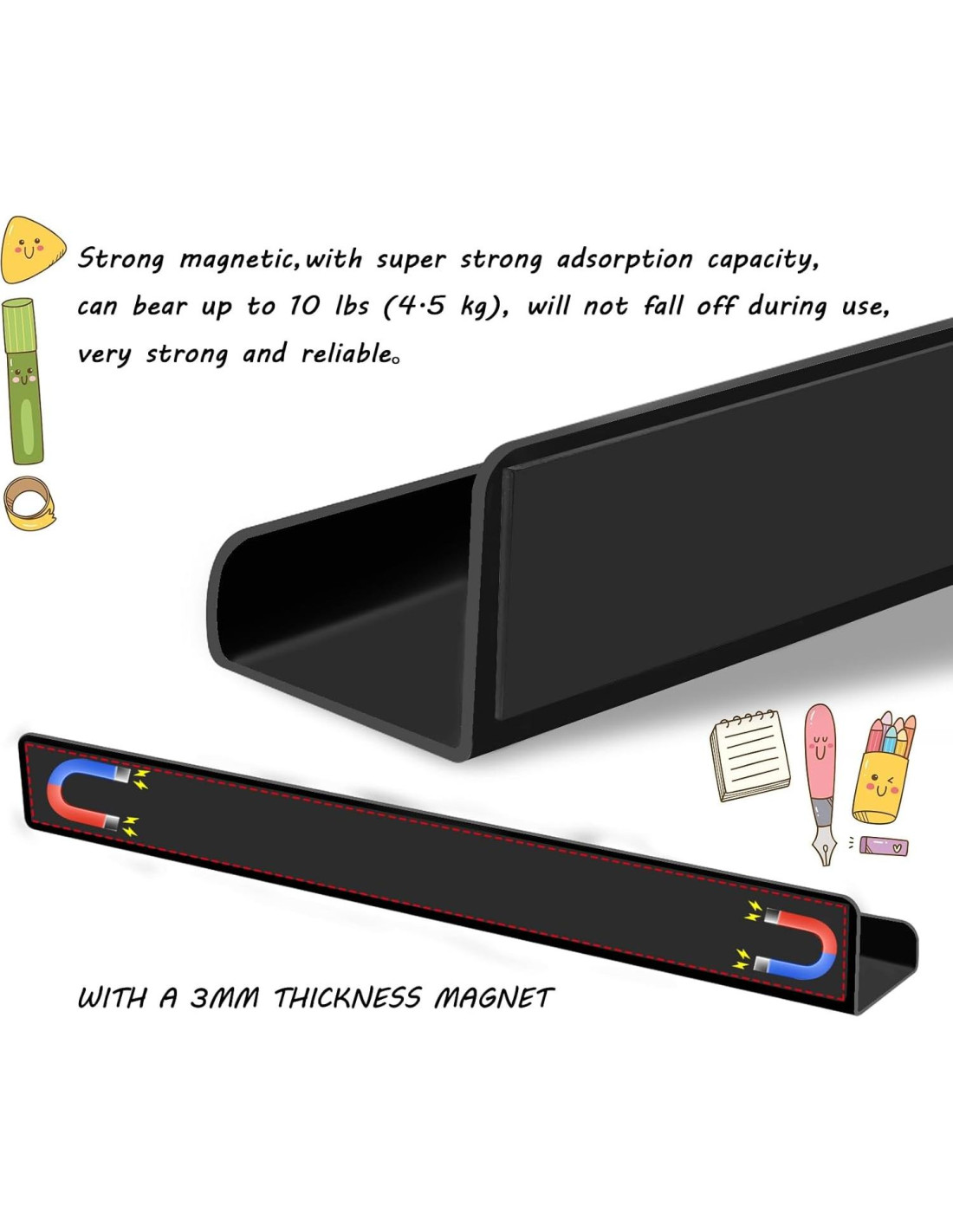- Súper Magnético: Estos estantes de libros magnéticos para el aula adoptan una tira magnética más grande y gruesa, con una capacidad de adsorción súper fuerte, soportando hasta 4.54 kg, que no se caerá fácilmente durante su uso, muy sólido y confiable. (El grosor de la tira magnética es 3 mm)
