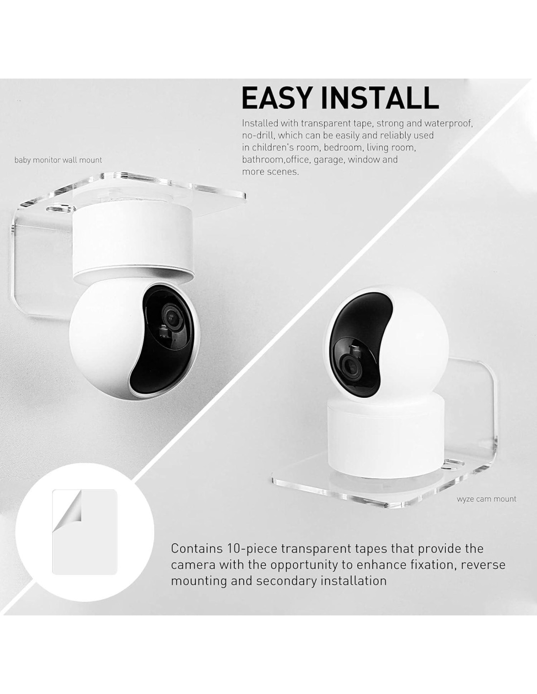 - FÁCIL INSTALACIÓN: Instalado con cinta transparente, fuerte e impermeable, sin taladro, que se puede usar de manera fácil y confiable en la habitación de los niños, dormitorio, sala de estar, baño, oficina, garaje, ventana y más escenas. Contiene 10 cintas que brindan a la cámara la oportunidad de mejorar la fijación, montaje inverso e instalación secundaria.