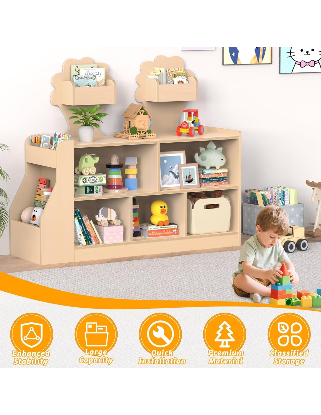 - 10 Compartimentos con Diseño de Árbol Único: Este versátil estante de almacenamiento de juguetes incluye 10 espacios de almacenamiento en total: 5 cubículos horizontales, 3 contenedores abiertos, 2 estantes verticales decorativos en estilo árbol y una cesta lateral incorporada. Diseñado para ayudar a los niños a organizar fácilmente sus juguetes y libros, este estante de aula también funciona muy bien en salas de estar o entradas como almacenamiento adicional para las necesidades familiares.