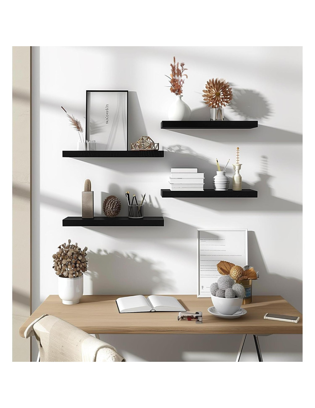 - Estantes Flotantes de Madera Real: Fabricados con madera maciza para un diseño duradero y resistente. Los estantes flotantes de madera PHPH con grano de madera natural dan una sensación rústica a cualquier espacio.