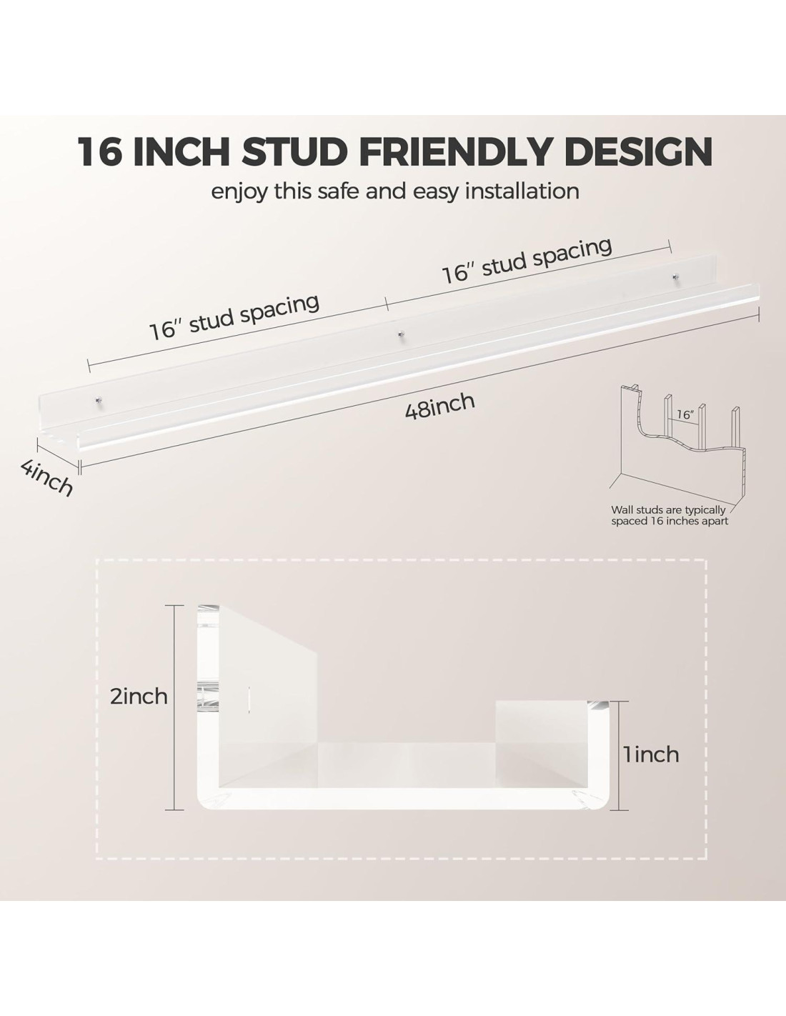 - Diseño de separación de montantes de 16 pulgadas: su orificio de montaje está diseñado a 40.64 centímetros de distancia para una instalación segura en montantes de pared, permitiendo que el estante se monte de manera segura en la pared con mayor capacidad de carga. Fácil de instalar, incluso los bordes están pulidos y vienen con los accesorios necesarios.