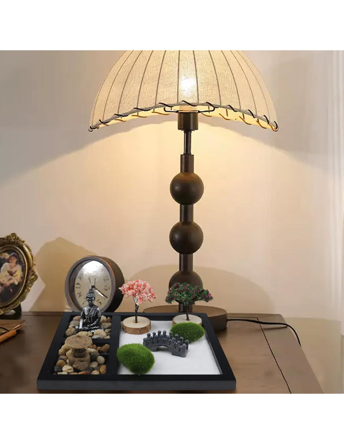 - Kit Completo: El kit de terapia con arena incluye rocas de musgo, puente de piedra, árbol verde, luz de piedra, estatua de Buda, árbol de sakura, arena y piedra para crear un paisaje bellamente sereno.