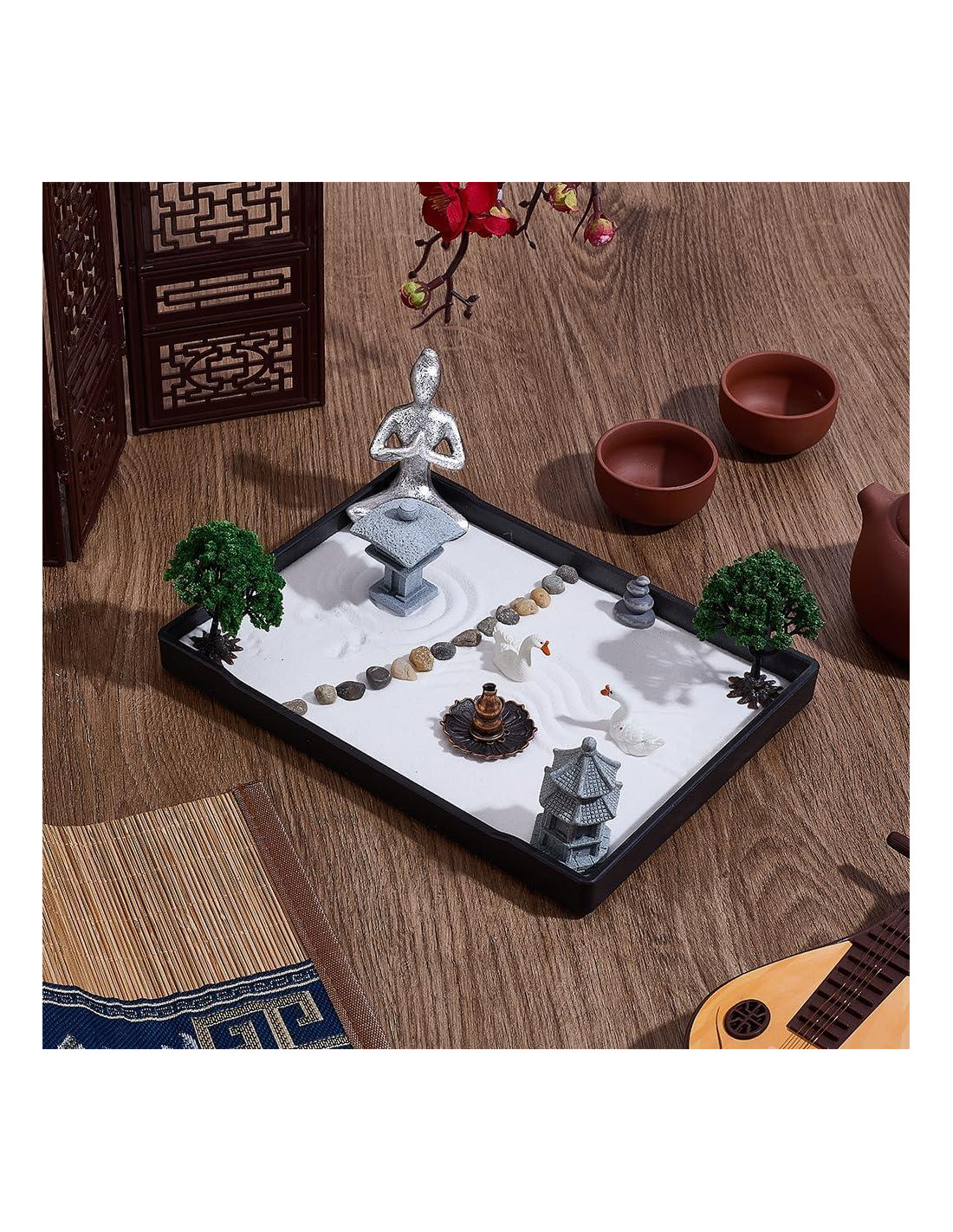 - Experiencia Zen completa: Incluye todos los accesorios que necesitas para comenzar, bandeja, arena blanca, piedras, estatua de meditación, árbol simulado, una variedad de decoraciones y plantas simuladas para crear un vibrante paisaje Zen