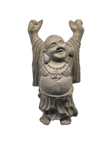 Este Buda jovial se encuentra con las manos levantadas en el aire, esparciendo alegría y felicidad a todos los que lo rodean. Cada estatua está hecha de piedra volcánica que ha sido envejecida para mostrar los finos detalles. Esta estatua es perfecta para uso en interiores o exteriores.