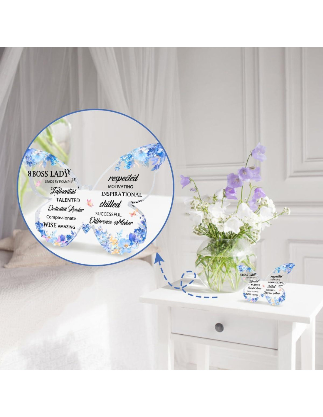 - Regalo que Inspira Energía Positiva: Este adorno de mariposa de acrílico está diseñado especialmente para jefas, y es un regalo único e inspirador, palabras de aliento diseñadas para iluminar e inspirar al destinatario. Tiene muchas palabras inspiradoras impresas en él, como "talentosa", "sabia", "compasiva", "habilidosa", "exitosa", etc. Podemos expresar tu respeto y aprecio a tu jefa, es un regalo ideal de amistad. El patrón y las palabras anteriores muestran tu creencia profundamente