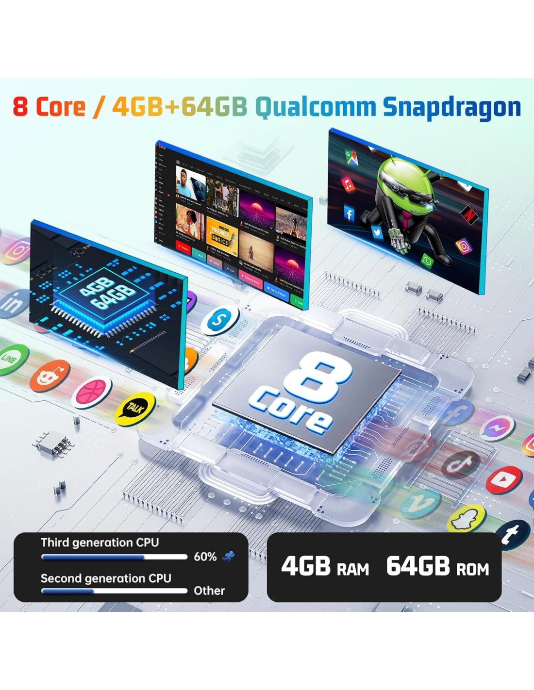 - Chip Qualcomm de 8 Núcleos y Sistema Android 15, 4G + 64G: Radio Android impulsada por un chip Qualcomm de 8 núcleos y funcionando en el último Sistema Android 15, con 4G de RAM y 64G de almacenamiento ROM, este estéreo asegura un rendimiento ultrarrápido. La radio del automóvil realiza múltiples tareas sin esfuerzo entre navegación, transmisión de música y otras aplicaciones sin ningún retraso, mientras tiene espacio suficiente para almacenar tus medios y aplicaciones favoritas.