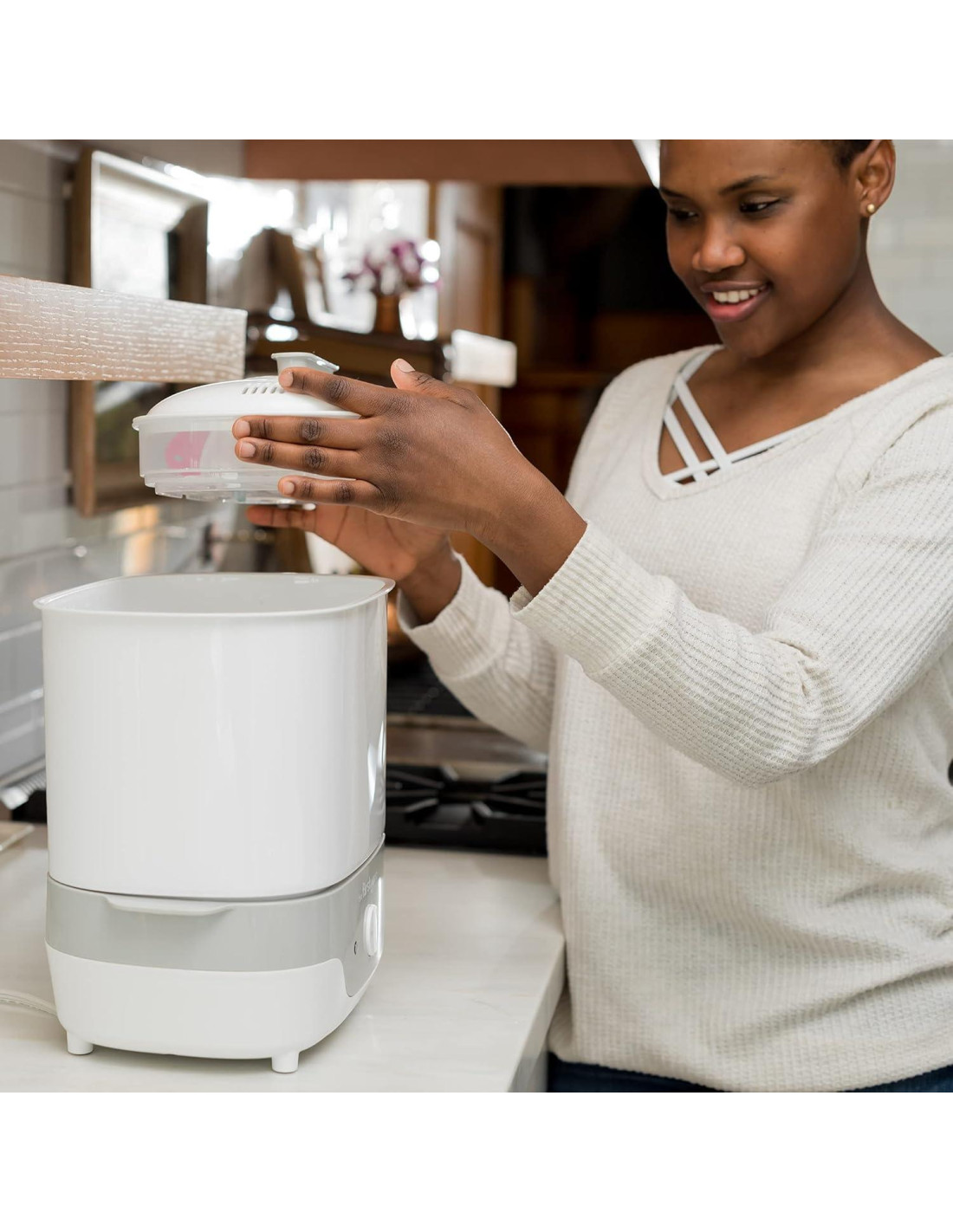 Elimina gérmenes de manera natural con el Esterilizador de Vapor Modular de El Primer Años. El vapor natural mata el 99% de los gérmenes comunes en minutos; no hay necesidad de productos químicos agresivos o aditivos. El diseño modular, con dos bandejas, proporciona mucho espacio para esterilizar mientras ahorra espacio en la encimera. La bandeja superior es perfecta para pezones de biberones, mordedores, piezas de extractores de leche, chupetes y otros artículos más pequeños. La bandeja inferior está especialmente diseñada para biberones, tazas y artículos más grandes. Usa una bandeja, o ambas según tus necesidades del día. El ingenioso diseño de la bandeja inferior dirige el vapor profundamente dentro de los biberones y ambas bandejas circulan completamente el vapor para asegurarse de que cada superficie esté cubierta. Este esterilizador de vapor también funciona como un práctico espacio de almacenamiento, manteniendo los artículos dentro esterilizados durante hasta 24 horas.