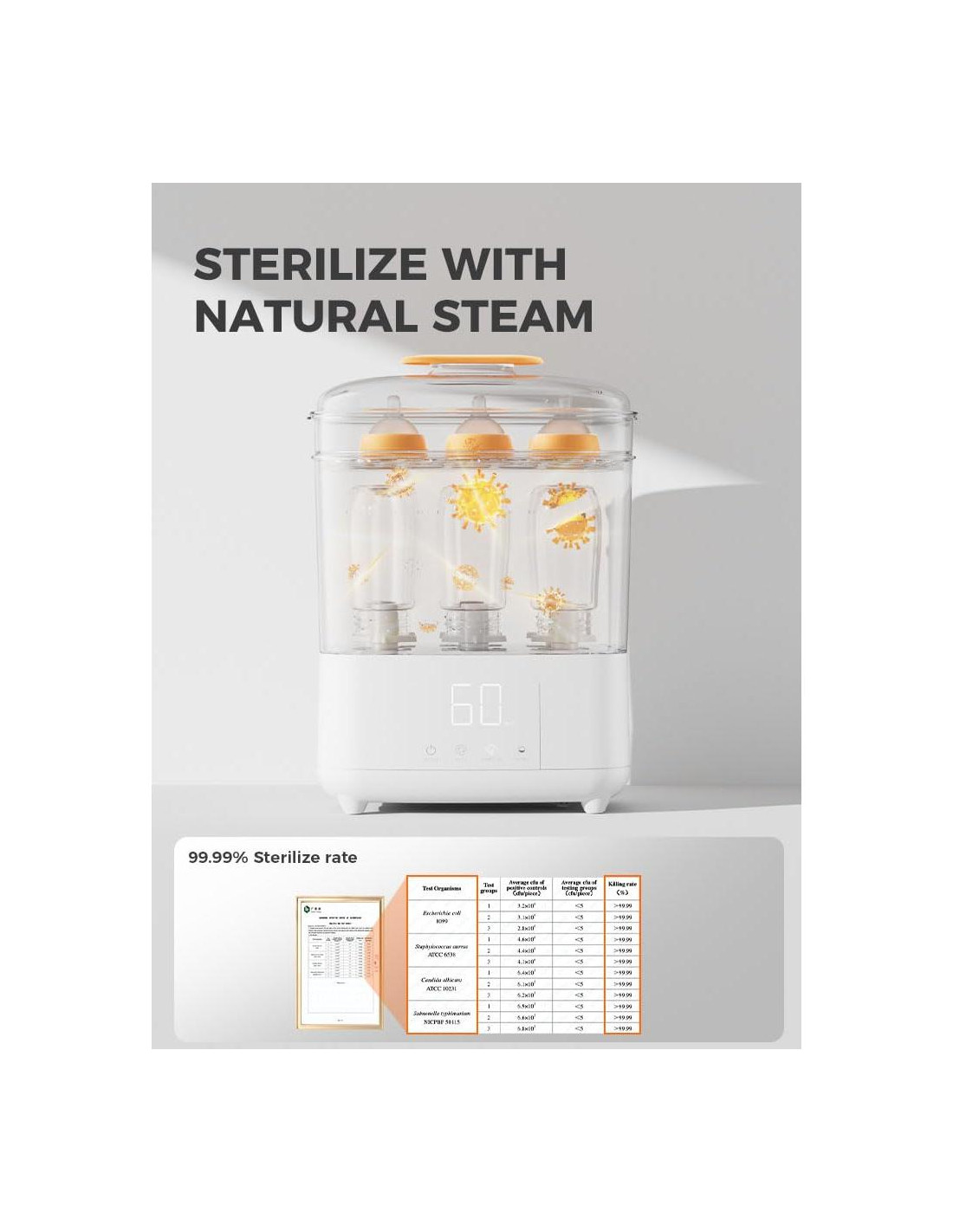 - Esterilización Eficiente: Con vapor a alta temperatura de 360 y 600W de potencia para una esterilización más fuerte, puede esterilizar y secar rápidamente biberones con una tasa de esterilización del 99.99%. Esto asegura la seguridad del bebé y brinda tranquilidad a los padres.