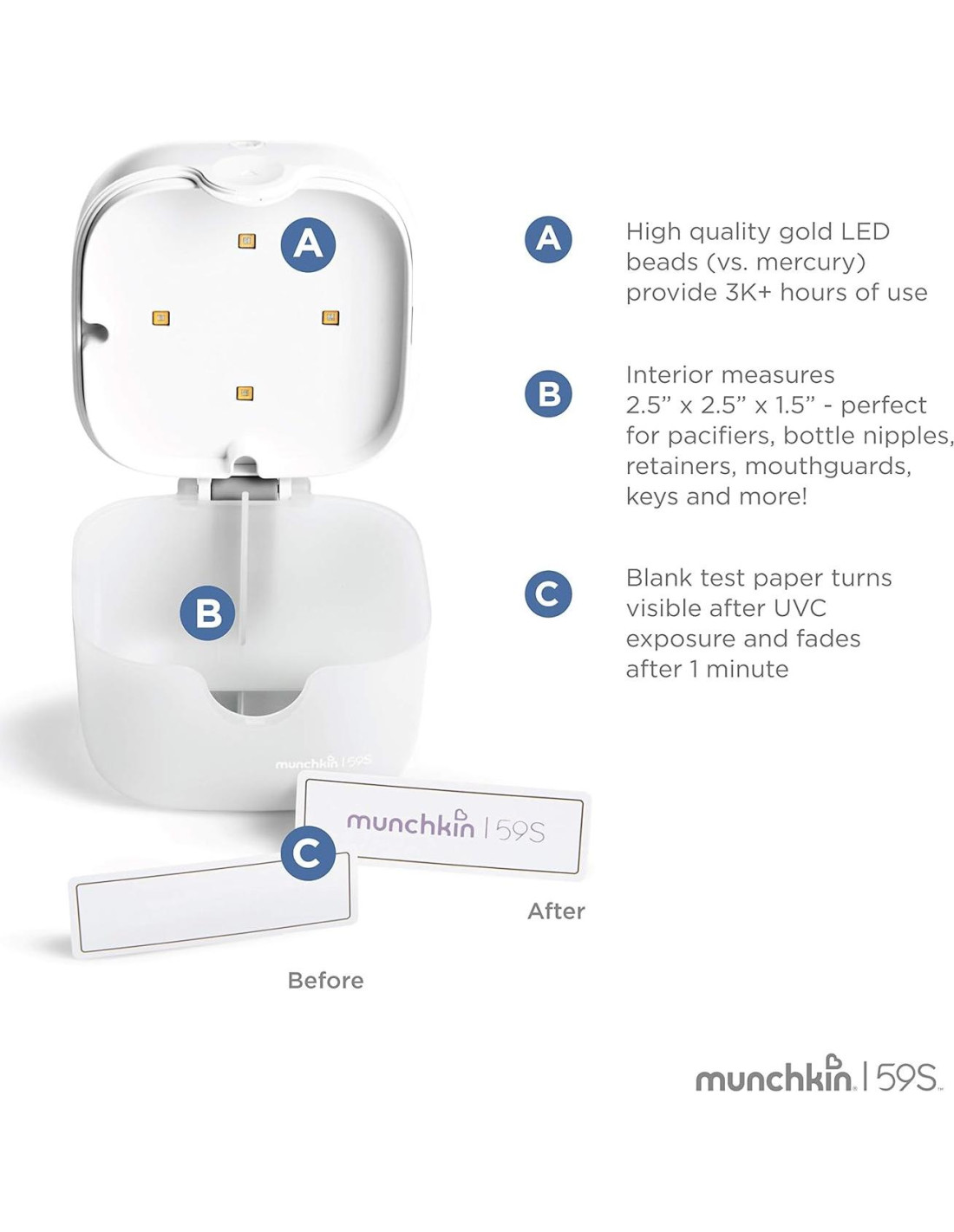 Los bebés dejan caer cosas en lugares sucios en los peores momentos. El esterilizador Mini Plus portátil desinfecta chupetes, tetinas de biberón y más en menos de un minuto y es alimentado por una batería recargable de iones de litio, por lo que puedes esterilizar artículos por más tiempo mientras estás en movimiento. El Mini Esterilizador Plus elimina de manera segura el 99.99% de gérmenes, bacterias y virus utilizando solo luz UV y ha sido probado por laboratorios independientes. ¡No se necesitan químicos, calor ni agua! Las 4 luces LED UV chapadas en oro del esterilizador Mini son libres de mercurio y se apagan automáticamente cuando se abre la tapa. Este pequeño dispositivo es fácil de meter (o adjuntar) a un bolso o pañalera, así que cuando lo necesites, estará a la mano. Perfecto para usar en casa, pero especialmente útil en espacios públicos como guarderías, parques infantiles, consultorios médicos, aeropuertos y más. La batería recargable de iones de litio dura más de 100 ciclos de uso con una carga completa; para recargar, simplemente conecta el cable USB incluido a un banco de energía portátil, cargador de coche o computadora portátil. La luz UV es un método seguro y comprobado para matar bacterias que es utilizado por hospitales para desinfectar todo, desde quirófanos hasta equipos quirúrgicos. Munchkin se ha asociado con 59S, el líder en tecnología LED UV, para desarrollar soluciones de esterilización convenientes basadas en UV que ayudan a las familias con niños pequeños a llevar vidas más saludables.