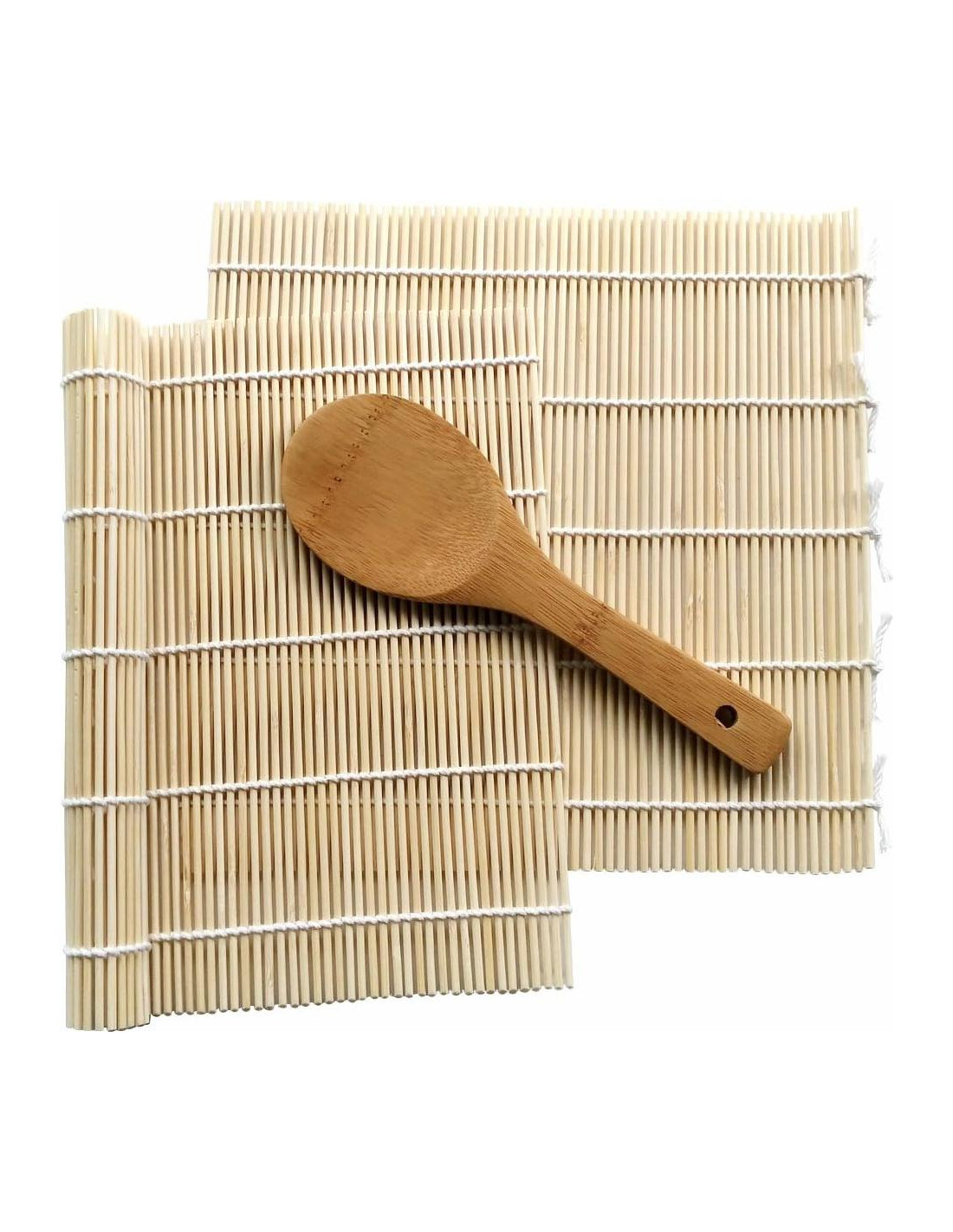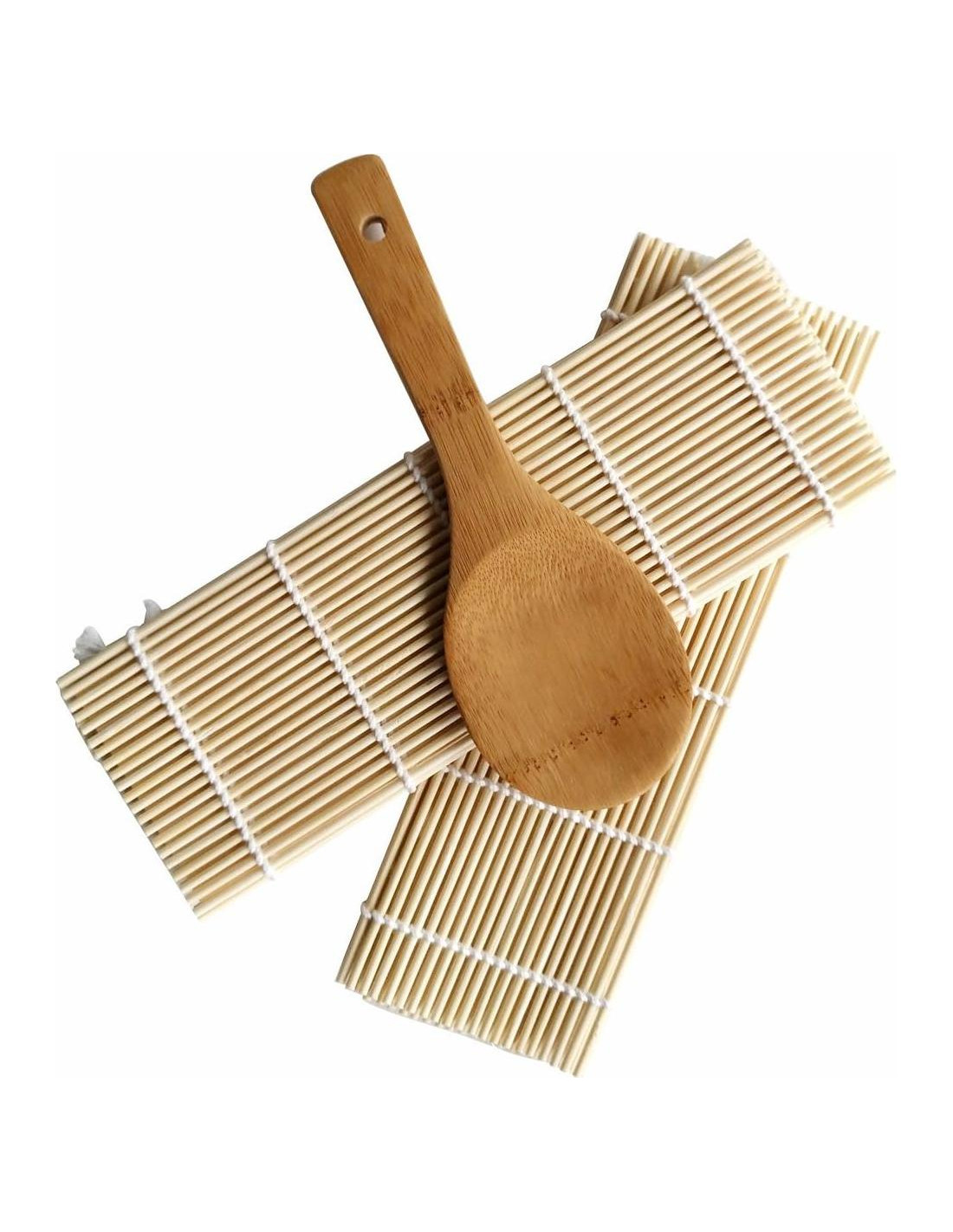 Estera de bambú para sushi, gimbap de 9.4 pulgadas (23.9 cm) para hacer rollos de sushi, una gran estera de bambú para hacer rollos de sushi. Dimensiones: estera de bambú: 9.5 pulgadas (24.1 cm) x 9.5 pulgadas (24.1 cm), pala de arroz: 8 pulgadas (20.3 cm) de largo. Material: bambú natural.