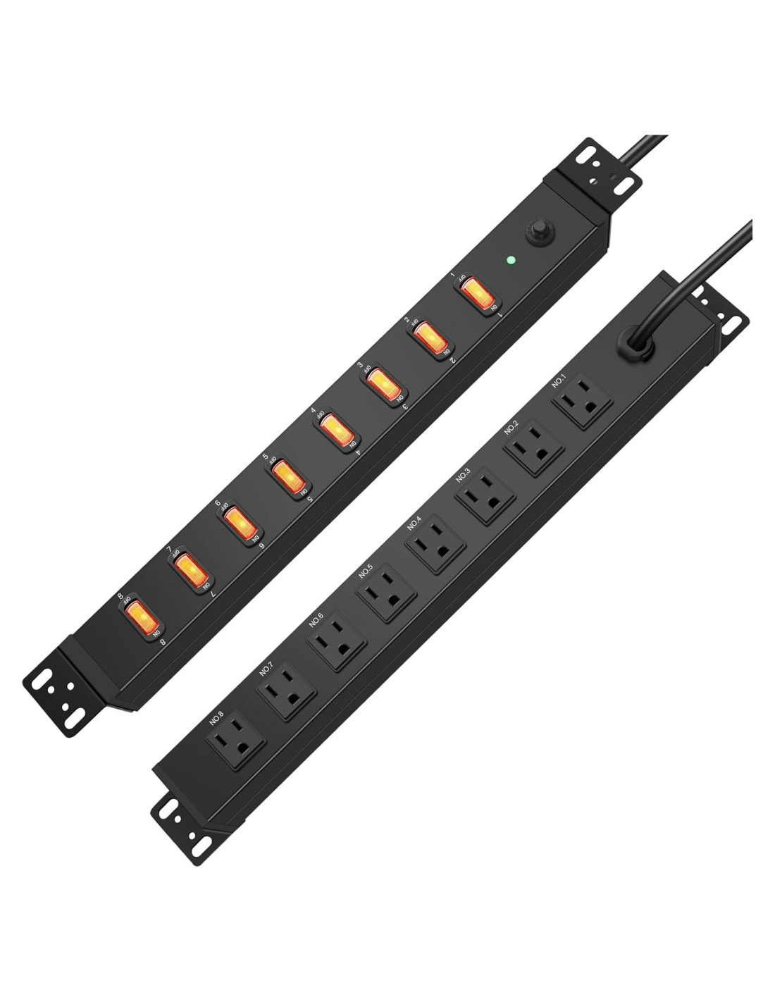 - Regleta de Alimentación de Metal Montable: Esta regleta de alimentación montable en rack tiene 8 salidas y 8 interruptores iluminados individuales para cuando necesites usar más dispositivos, permitiéndote apagar dispositivos no necesarios individualmente sin apagarlos todos.