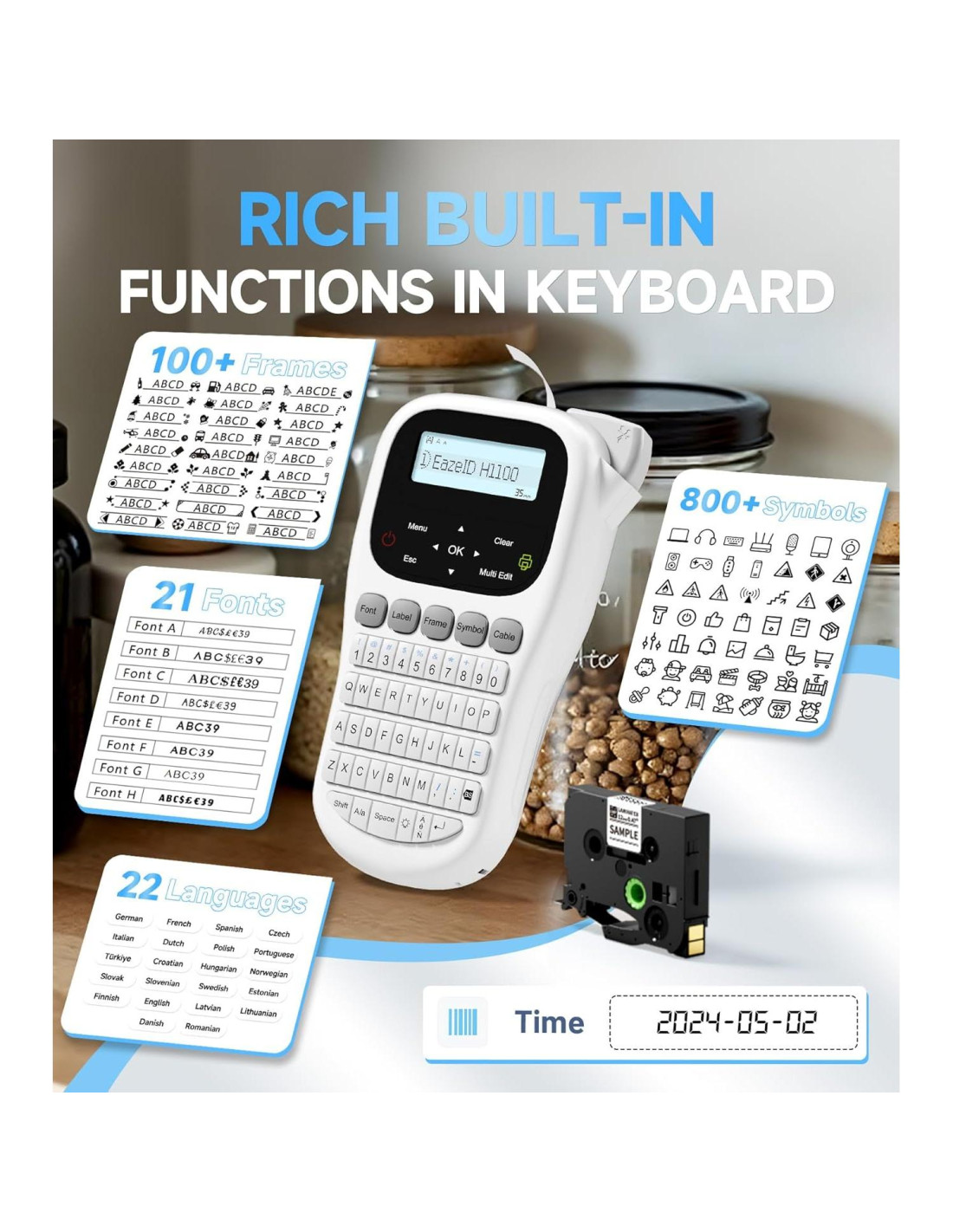 - Etiquetas Personalizadas DIY: Para los usuarios que buscan personalización avanzada, la máquina etiquetadora EazeID H1100 cuenta con 21 fuentes, más de 100 bordes, más de 800 adhesivos y símbolos, y 22 idiomas. La etiquetadora también admite impresión de códigos de barras, añadiendo un valor significativo. Las múltiples fuentes y símbolos hacen que el etiquetado sea más dinámico y personalizado. Ya sea para organización en el hogar o propósitos comerciales, esta característica asegura que las etiquetas se adapten a necesidades específicas