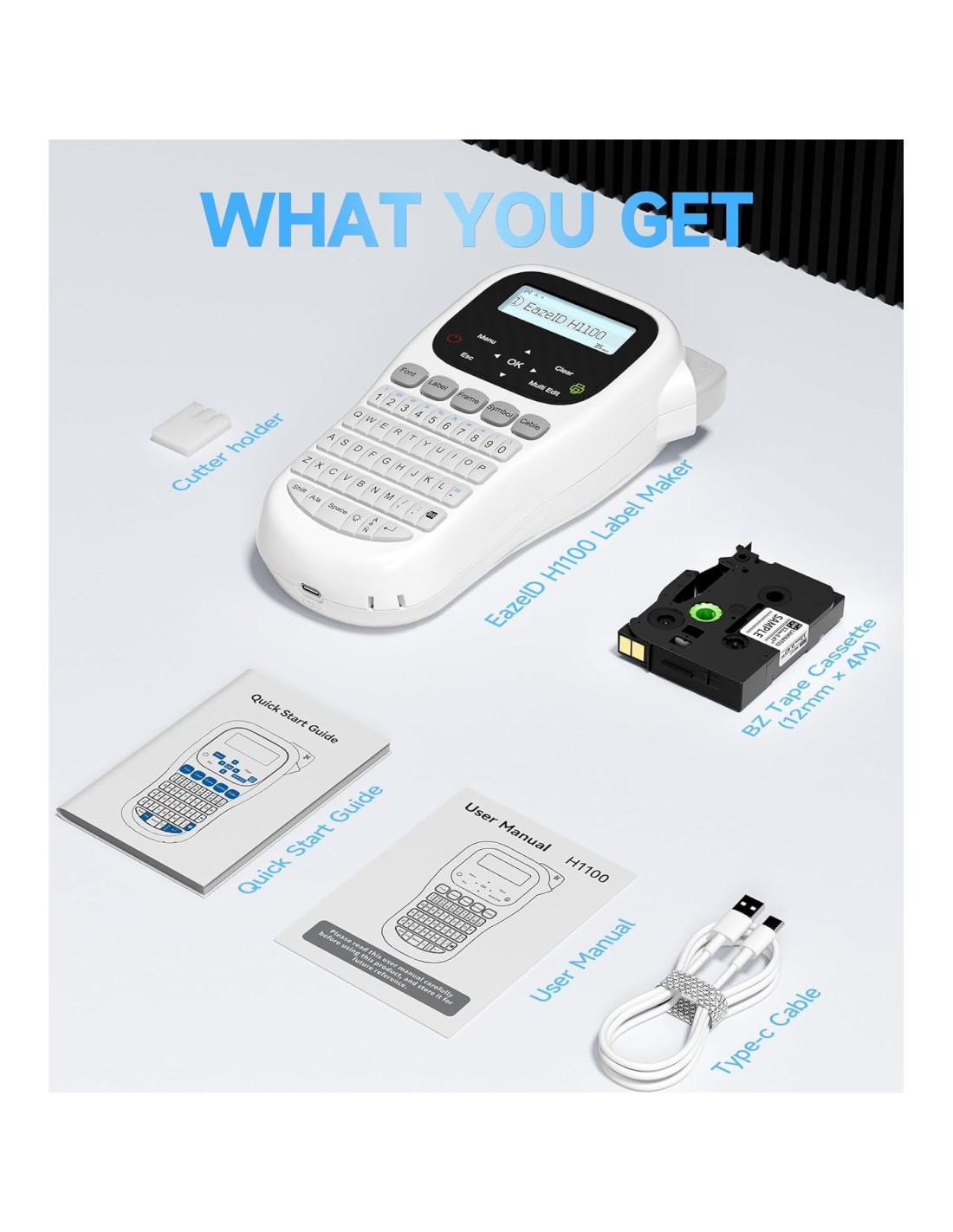 - Componentes incluidos: Manual del usuario * 1, Máquina de Etiquetas EazeID H1100 (Blanco-Gris) * 1, Cable USB C * 1, Soporte de Cortador de Reemplazo * 1, Cinta Blanca Laminada de 12mm 0.47 (Cinta de Muestra 4M*12mm) * 1