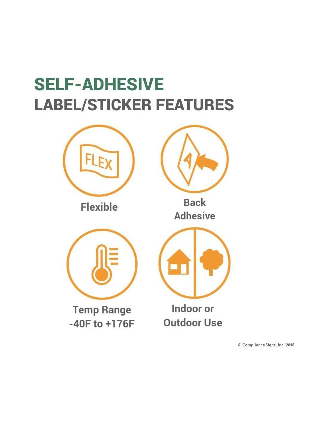 Utilice esta etiqueta autoadhesiva para publicar fácilmente información importante en entradas o salidas - solo pele y pegue. Esta etiqueta / calcomanía / adhesivo está fabricada en vinilo brillante e incluye adhesivo permanente. Esta etiqueta de entrada / salida cuenta con un recubrimiento de laminado claro que resiste UV, productos químicos, abrasión y humedad para una larga vida útil. Es adecuada para su uso a temperaturas de -40 a +82.2 C. Las etiquetas de salida y entrada de ComplianceSigns se fabrican por encargo en los EE. UU. y se utilizan comúnmente en entornos industriales, comerciales, públicos y privados.