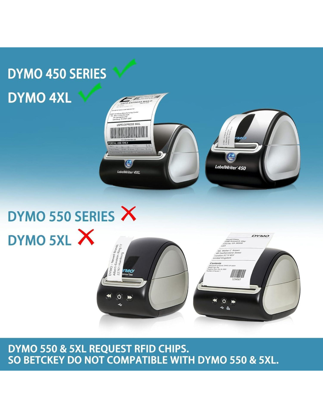 - Consejos Calientes : No compatible con impresoras DYMO 550 & 5XL que requieren chips RFID.