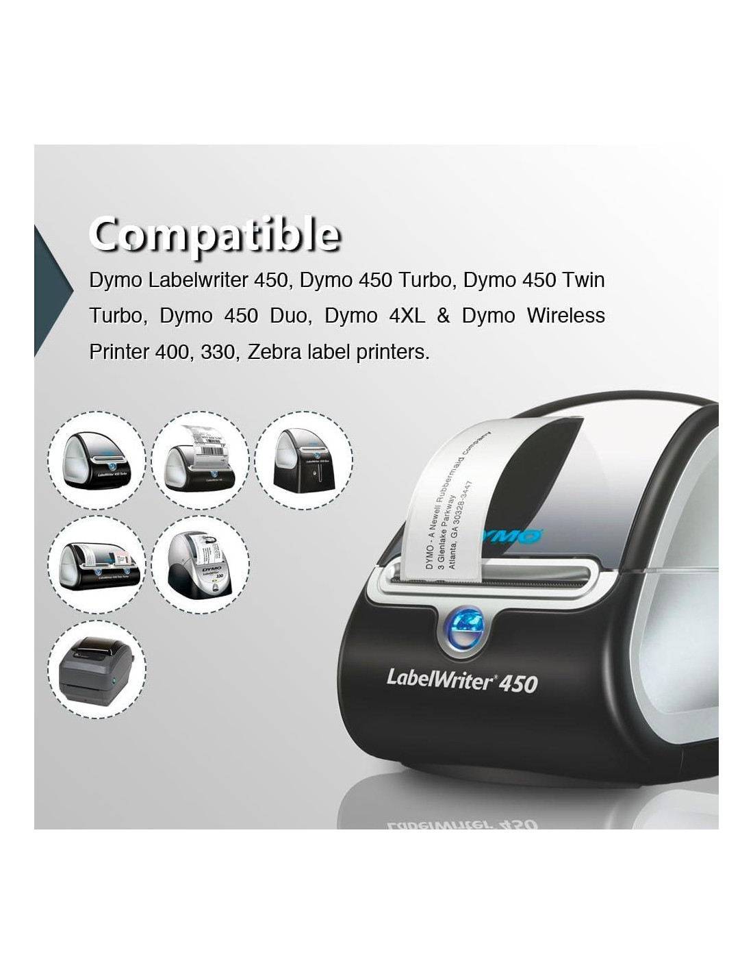 - [ Compatible ]: Adecuado para impresoras DYMO LabelWriter: DYMO 450, 450 Turbo, 450 Twin Turbo, 450 Duo, DYMO 4XL y DYMO Impresora Inalámbrica, 400, 332, Zebra y la mayoría de las impresoras térmicas de etiquetas que pueden ajustar el ancho de impresión a 1 pulgada