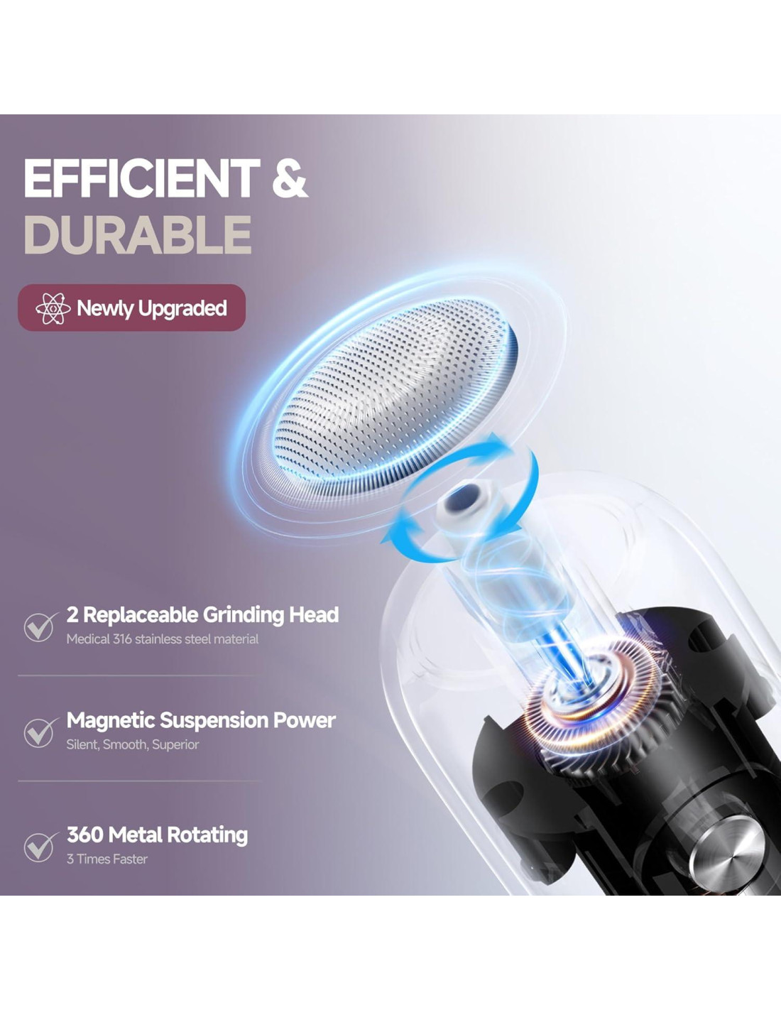 - Cabezas de Acero Inoxidable 316F Duraderas ¡Actualiza de las lijadoras manuales para pies! Este removedor de callos eléctrico utiliza cabezales de acero 316F de por vida (sin necesidad de reemplazos) para ahorrar $60/año y prevenir el crecimiento bacteriano, perfecto para rutinas higiénicas de limado eléctrico de pies.