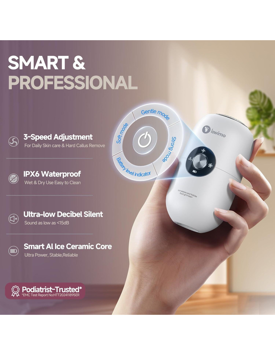 - Sistema de Molido de 3 Velocidades Nuestro removedor de callos eléctrico cuenta con un sistema de 3 velocidades de primera en la industria (1200/1400/1650 RPM) para una eliminación de callos 3 veces más rápida. El modo de 1650 RPM elimina callos de 3 mm de grosor en 10 segundos, ideal para usuarios de limas eléctricas que buscan resultados de nivel de salón durante un baño rápido.