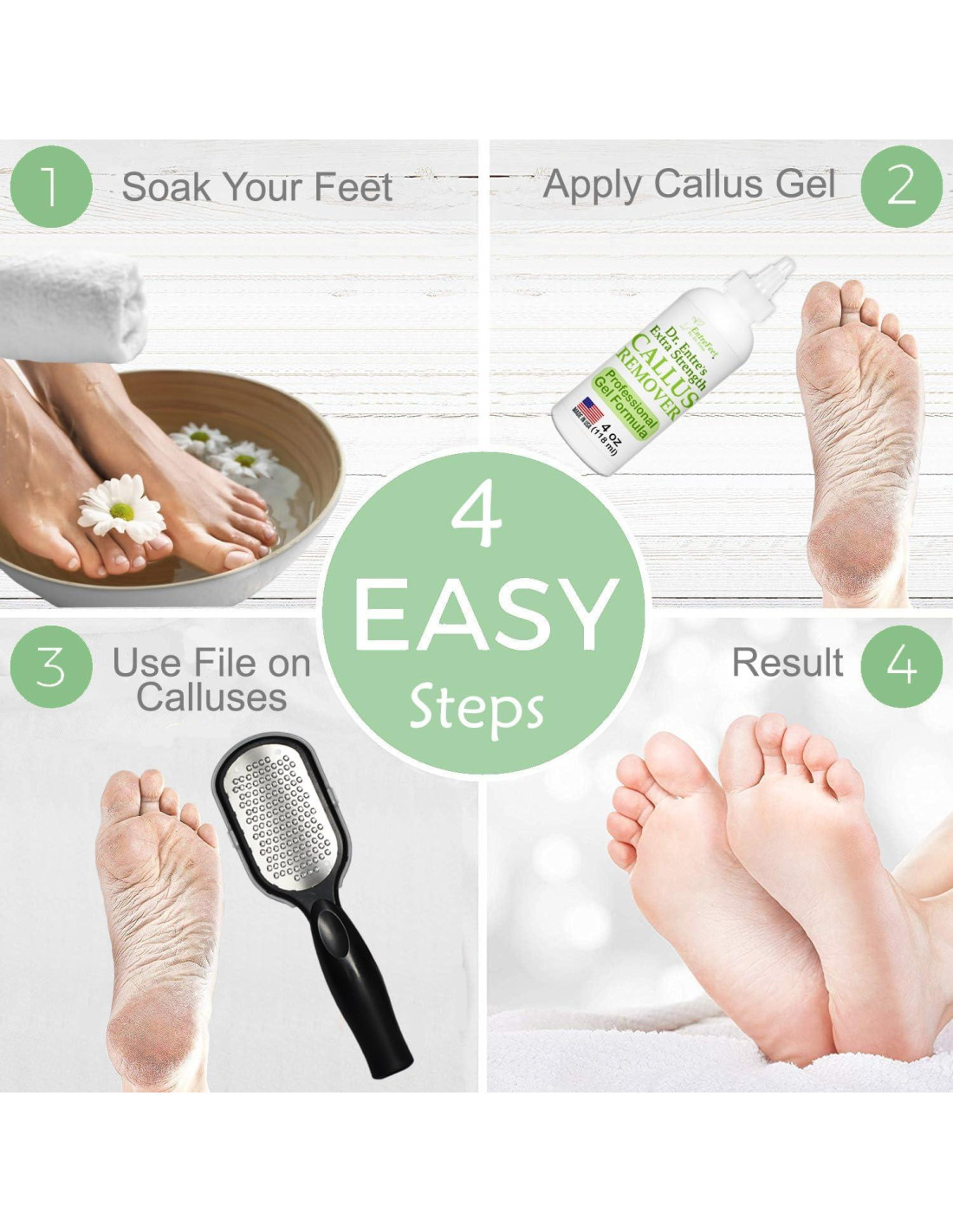- USO SIN ESFUERZO: Simplemente sumerge los pies en agua caliente, sécalos con una toalla limpia, luego aplica el gel en las áreas con callos. Deja el gel actuar durante 3-5 minutos y luego usa tu lima para pies como raspador o exfoliador para eliminar la piel muerta alrededor de los talones u otras áreas específicas. Enjuaga tus pies y ya está.