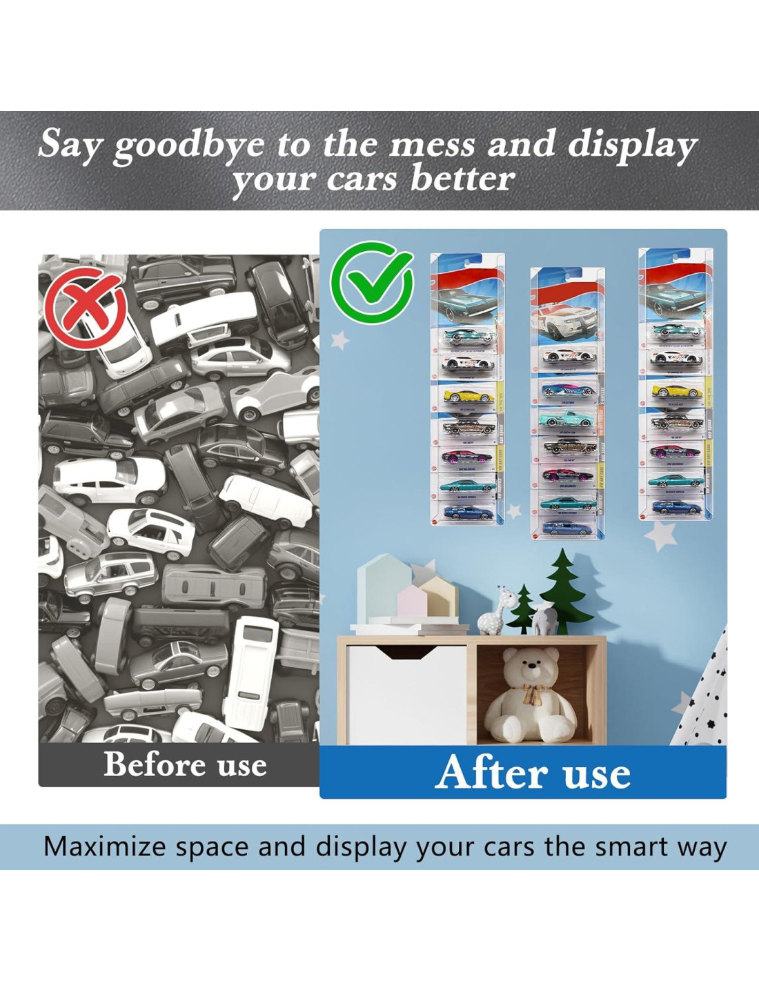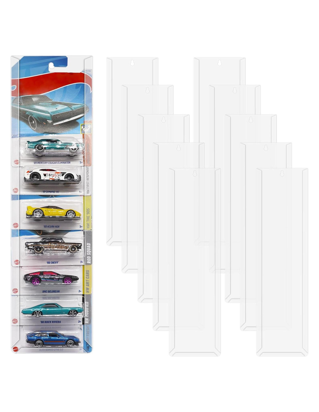 - Opciones de Montaje Versátiles: Elige entre la instalación con tornillos para una solución más permanente, que puede soportar hasta 7 autos por estuche, o la instalación con tiras adhesivas, que te permite exhibir de forma segura hasta 10 autos por estuche sin daños.