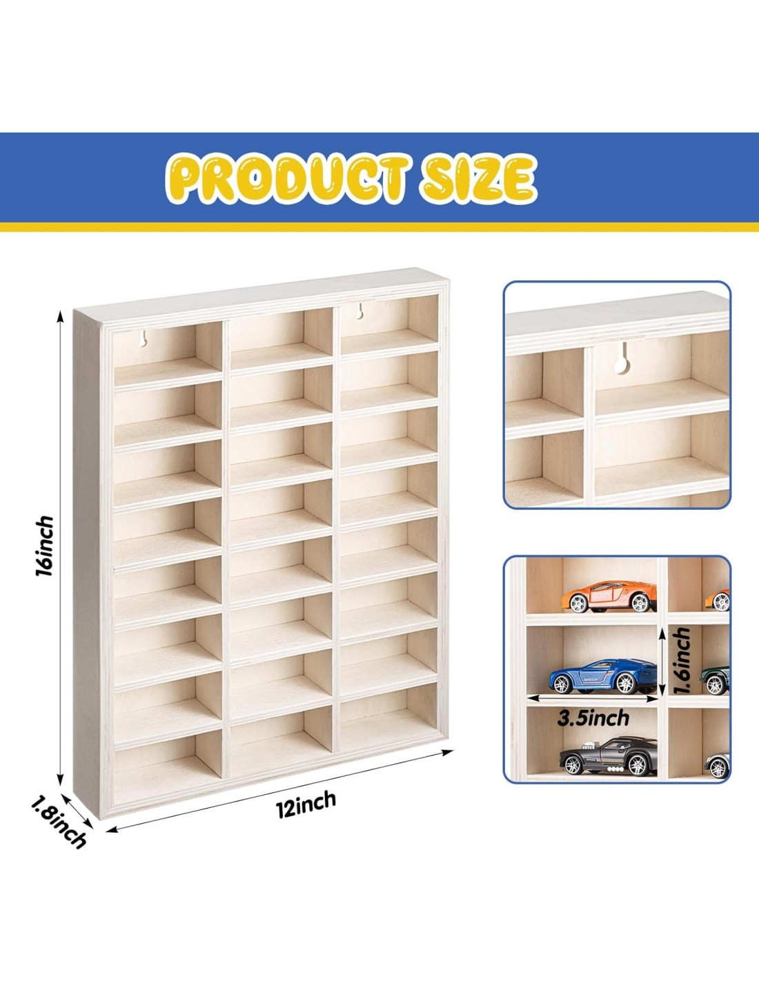 - Estante de Exhibición de Juguetes Bien Diseñado: benefíciese de un estante de exhibición de ruedas de juguetes diseñado específicamente para coleccionistas de coches de fundición; Este estante de madera de 3 x 8 tiene 24 compartimentos, adecuado para exhibir coches de modelo de fundición a escala 1: 64; Las dimensiones exteriores son 40.64 x 30.48 x 4.57 centímetros, y cada compartimento mide 8.89 x 4.06 centímetros