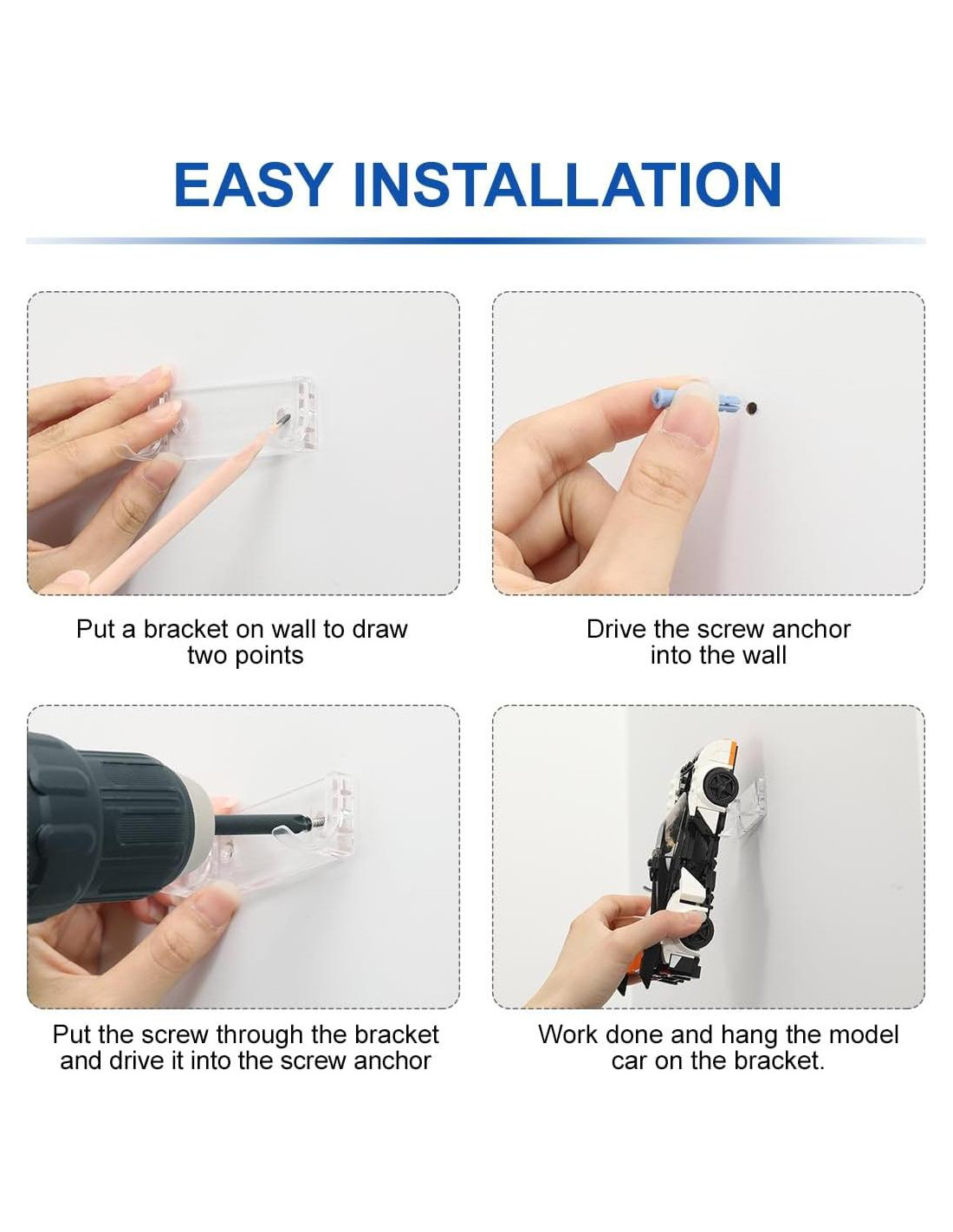 - Fácil Instalación: Estos soportes de exhibición de pared vienen con tornillos y anclajes, simplemente y de manera segura fija el soporte a la pared para mostrar perfectamente tu colección de autos de construcción. Es estable y no hay riesgo de caída, permitiéndote exhibirlo con confianza
