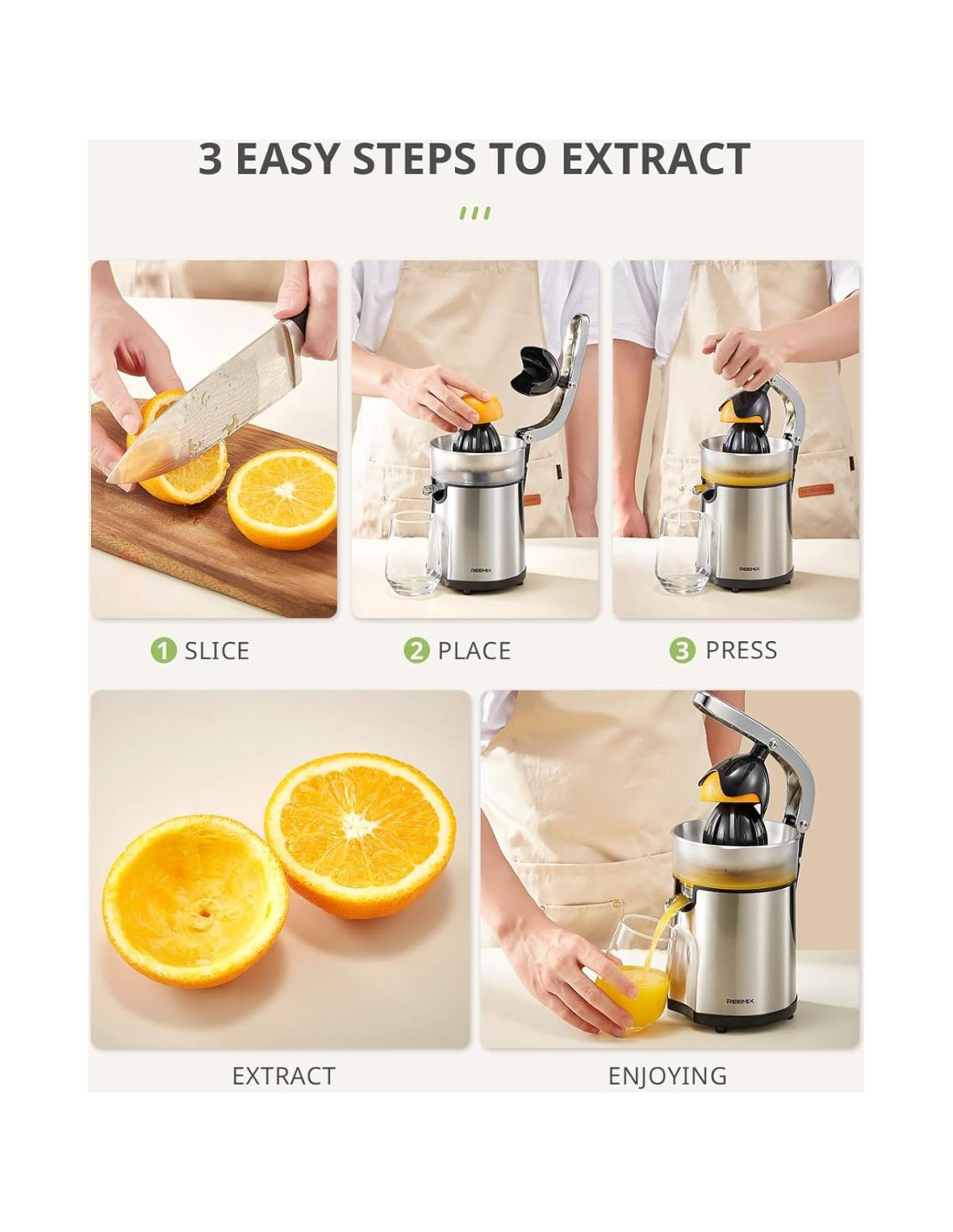 - Extracción de Cítricos Potente para Sabor Fresco: Diseñado para naranjas, limones, pomelos y otras frutas cítricas, este exprimidor eléctrico utiliza un motor de alto rendimiento para extraer cada gota de jugo mientras preserva los sabores y nutrientes naturales. Disfruta de un jugo vibrante y ácido en segundos