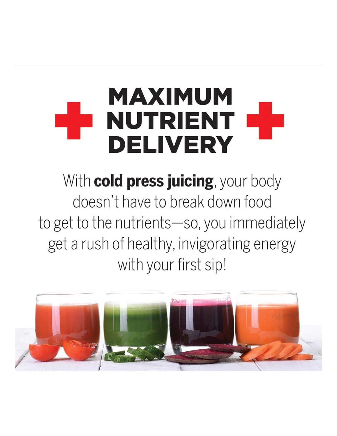 - Máximo Sabor y Nutrientes: Esta máquina exprimidora de frutas utiliza tecnología de masticación en tres etapas para extraer la máxima cantidad de nutrientes, vitaminas, sabor y jugo de cantidades mínimas de frutas, verduras, hojas verdes y pasto de trigo