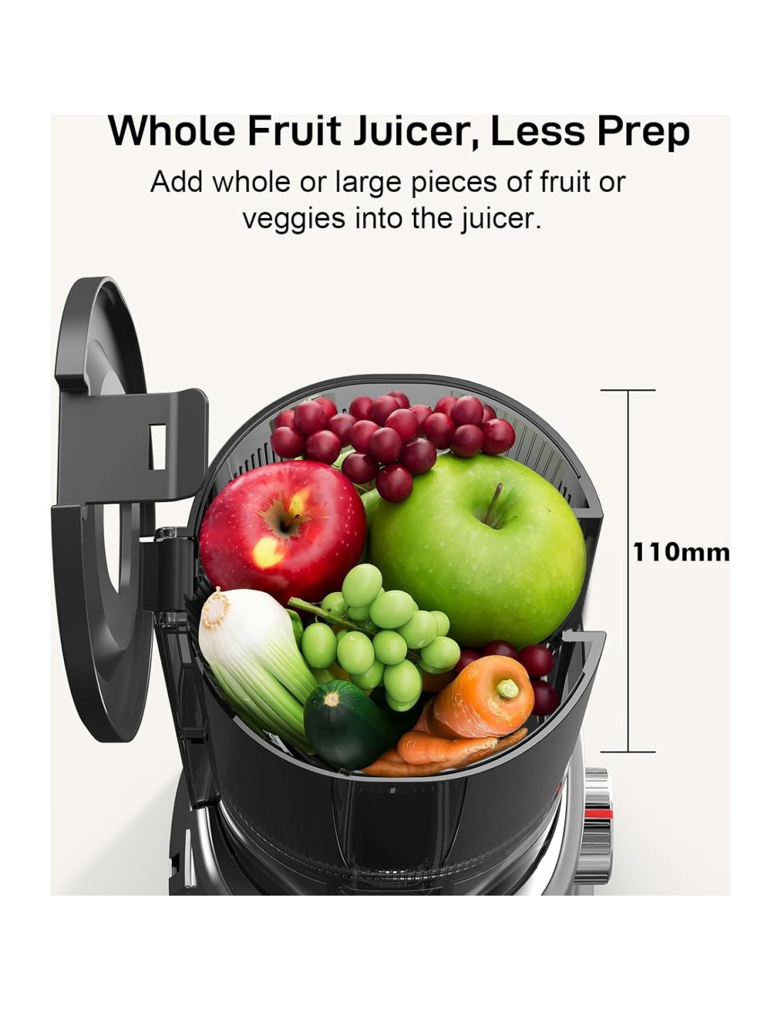 - Característica especial: Diseño para frutas enteras y verduras largas, extracción en frío, exprimidor lento entero, efectivo, motor DC silencioso de alta potencia de 150W, exprimidor lento entero, fácil de limpiar, fácil de ensamblar, abertura de alimentación extra grande de 110 mm