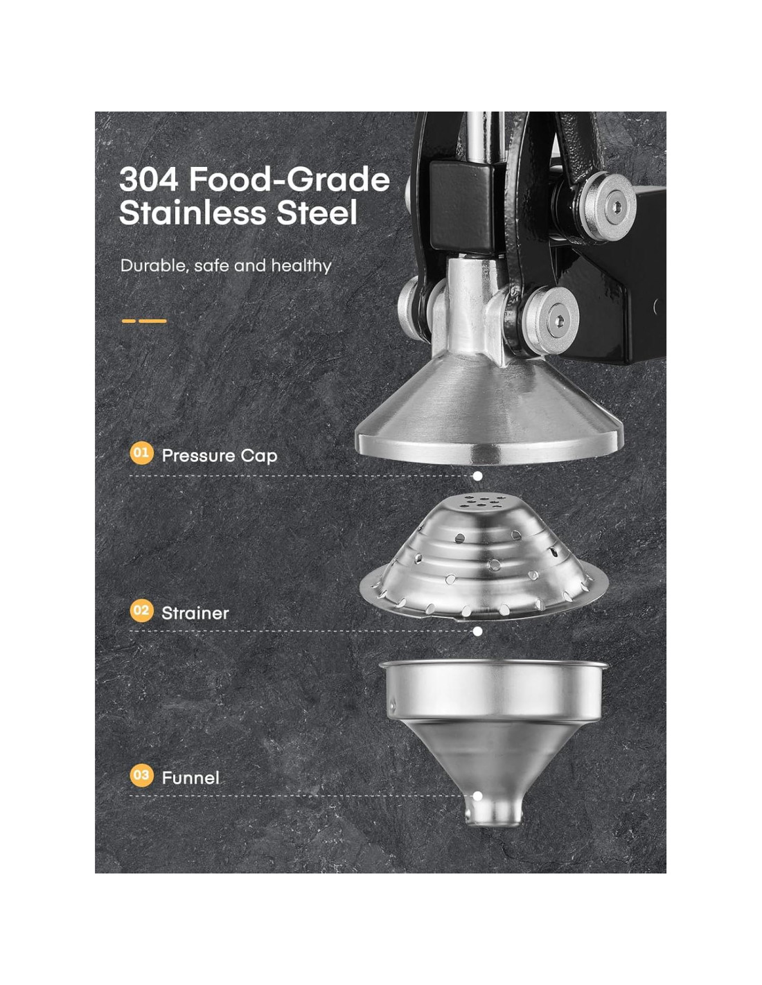 - Exprimidor de Cítricos Robusto y Duradero - Hecho de hierro fundido de alta resistencia y acero inoxidable, este exprimidor de mano es robusto y duradero para usar; Su tapa de presión, filtro y embudo están hechos de acero inoxidable de grado alimenticio y se pueden usar sin preocupaciones; Al mismo tiempo, estos accesorios son desmontables, fáciles de limpiar y aptos para lavavajillas, lo que hace que la limpieza sea muy sencilla;