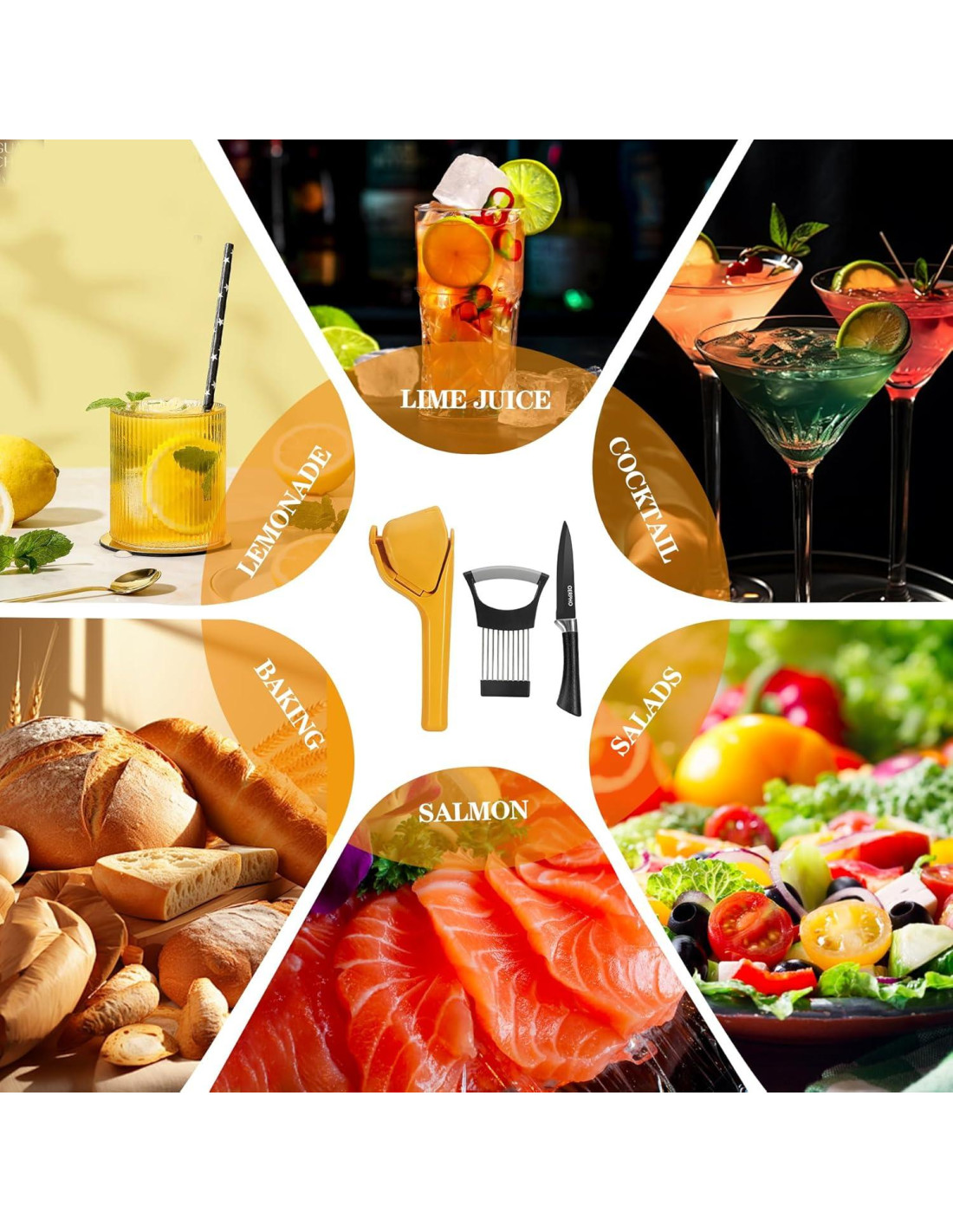 - [Versátil] El set de prensa de cítricos incluye un exprimidor de limones, un cortador de limones y un cuchillo de pelar, que no solo es adecuado para exprimir limones, mandarinas, naranjas, limas y otras frutas, sino que también incluye un cortador y un cuchillo de pelar para cortar y pelar cebollas, papas y tomates.
