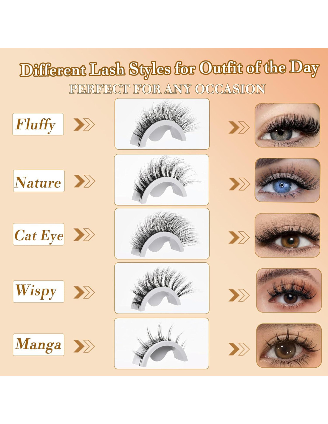 - [Diferentes Estilos y Pestañas Postizas Reutilizables] Las pestañas autoadhesivas Anforlin incluyen 5 pares de pestañas postizas, en 5 estilos diferentes: Esponjosa, Deshilachada, Ojo de Gato, Natural, Manga. Puedes elegir según tu maquillaje y atuendo del día. Y estas pestañas autoadhesivas se pueden usar muchas veces con el cuidado adecuado.