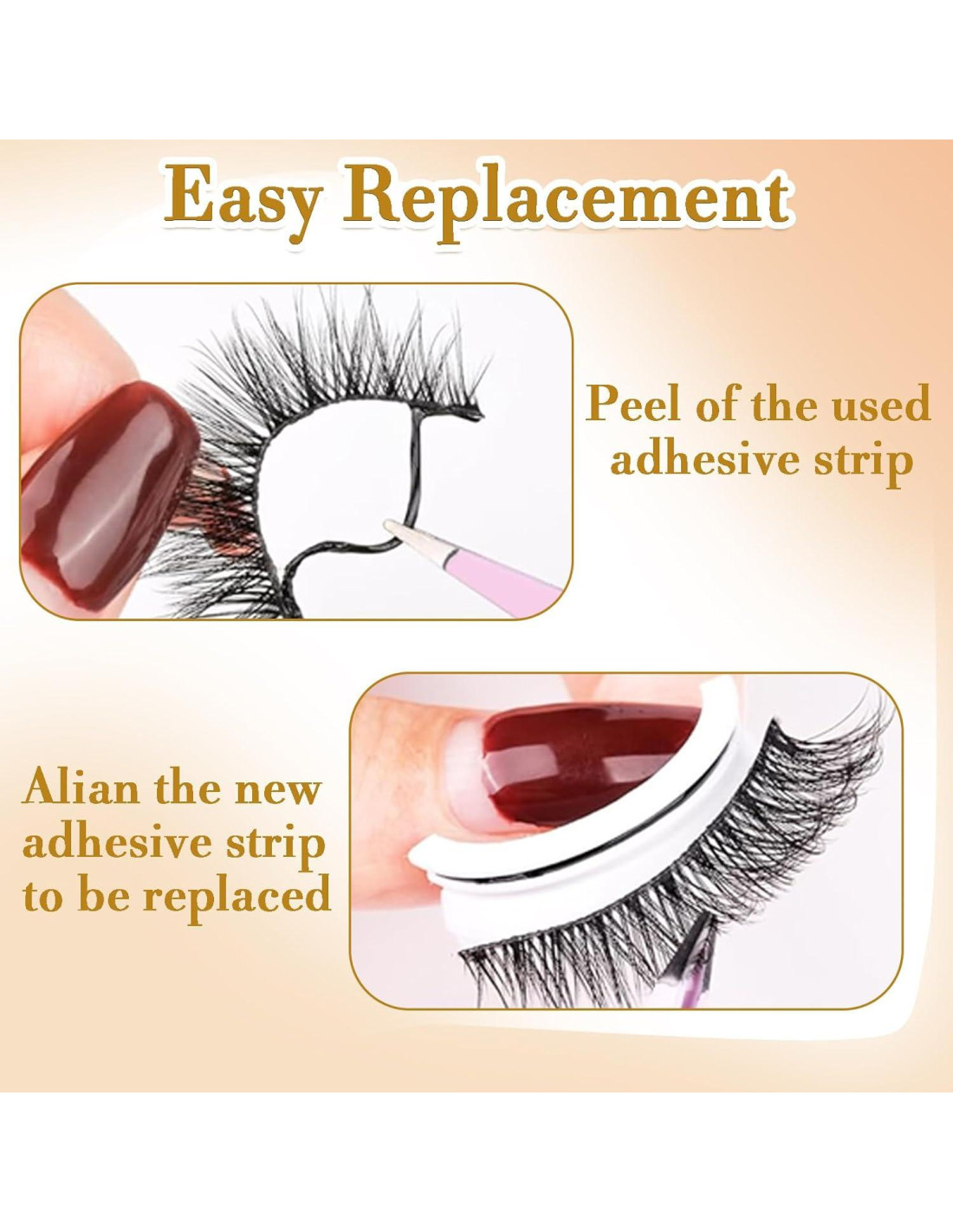 - [Más Tiras Autoadhesivas] Aplicamos una tira adhesiva adicional para cada par de pestañas autoadhesivas para que puedas aplicar la tira adhesiva tú mismo con unas pinzas más fácilmente. Consejos: Debido a la baja temperatura, puedes dejarla a temperatura ambiente durante 10 horas o usar un secador de pelo para calentar la banda autoadhesiva y que se adhiera como normalmente.