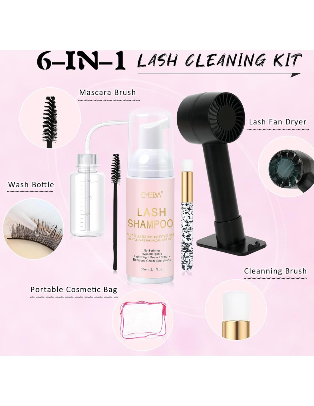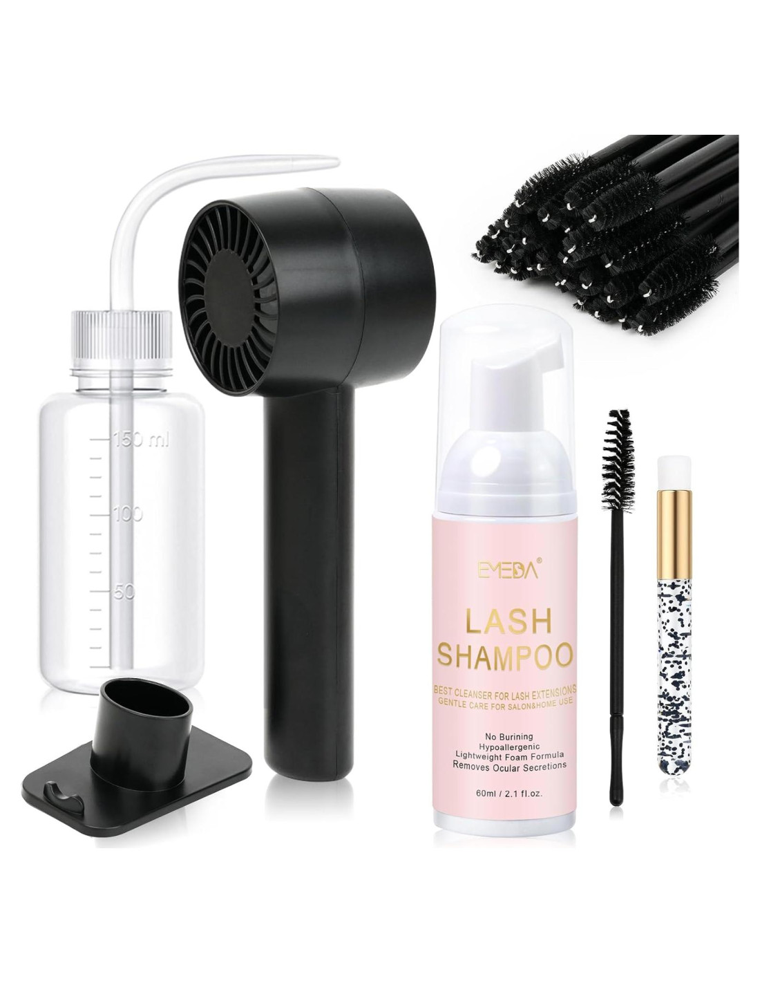 - El kit contiene: El nuevo kit de limpieza de pestañas EMEDA incluye 1 ventilador mini portátil USB superior, 1 champú para pestañas de 60ml, 1 botella de enjuague, 1 cepillo de limpieza y 25 cepillos para máscara. Un kit completo para tus necesidades de limpieza de pestañas en un solo momento.