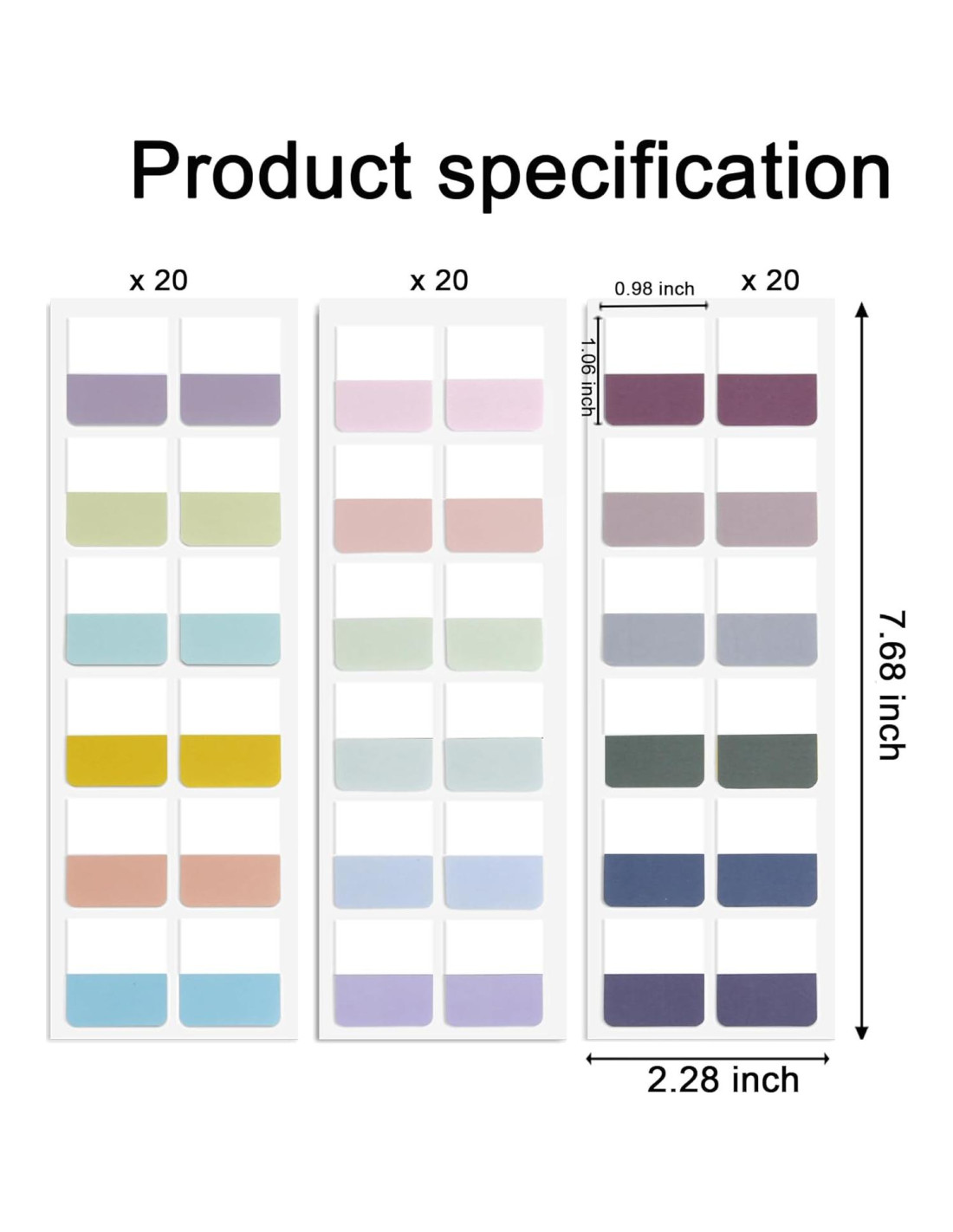 - El paquete contiene: 720 pcs de pestañas índice en total. El tamaño de una sola etiqueta adhesiva es 0.98"x1.06" (2.49cm x 2.69cm). Estas pestañas para cuadernos son relocables, fáciles de escribir y cumplen con los requisitos de escritura. Las pestañas divisorias son un total de 18 colores, lo que es mejor para distinguir el enfoque y facilitar la clasificación.