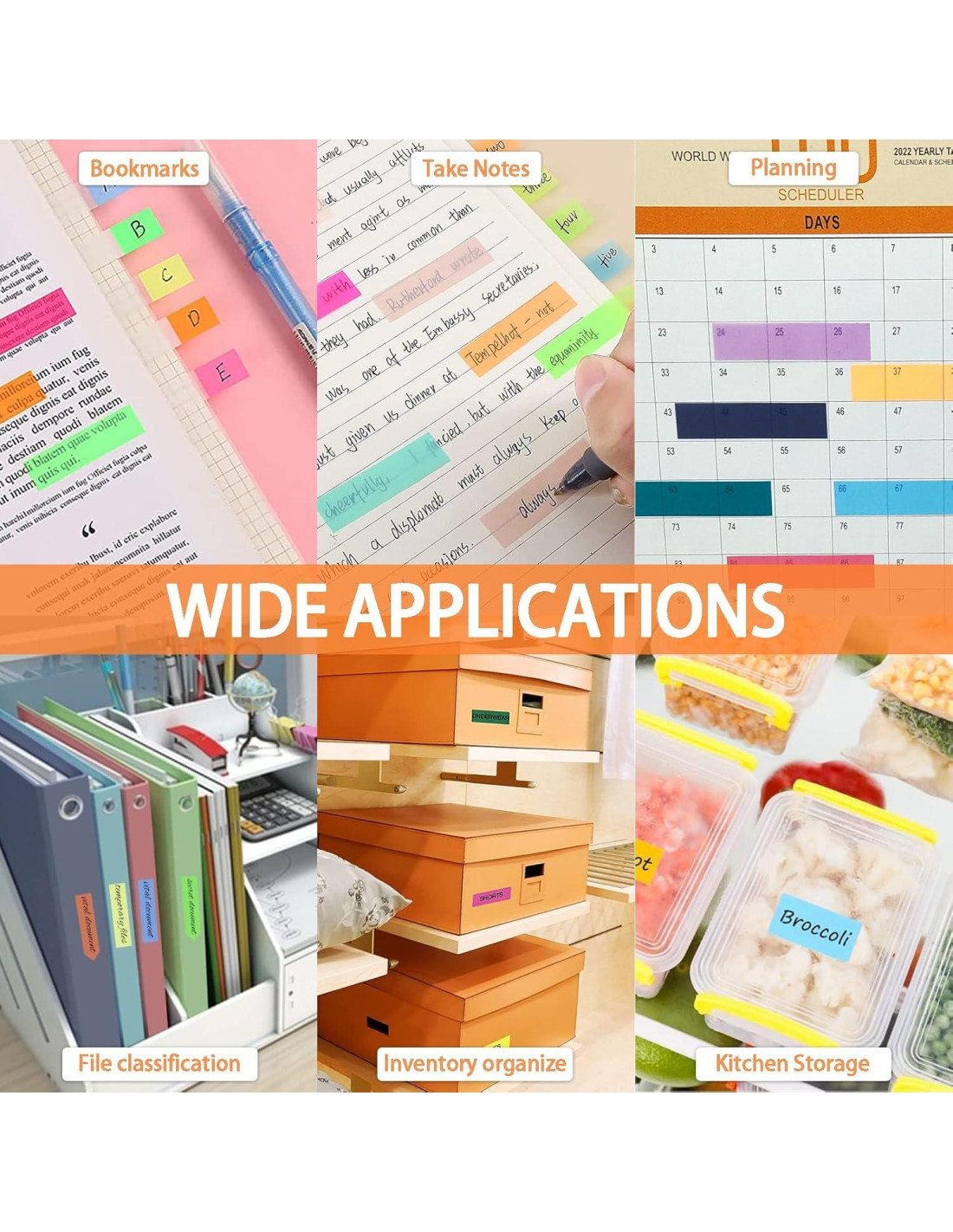 - [Clasificación y Enfoque] Con las Pestañas Adhesivas, puedes categorizar y resaltar información importante de manera efectiva. Estas pestañas son perfectas para codificar por colores y priorizar tareas, lo que te permite mejorar tu eficiencia en el trabajo y el estudio. Úsalas para marcar plazos, fechas importantes o puntos clave en tus notas. Al usar estas notas adhesivas y pestañas post-it, te mantendrás organizado y nunca te perderás un detalle importante nuevamente.