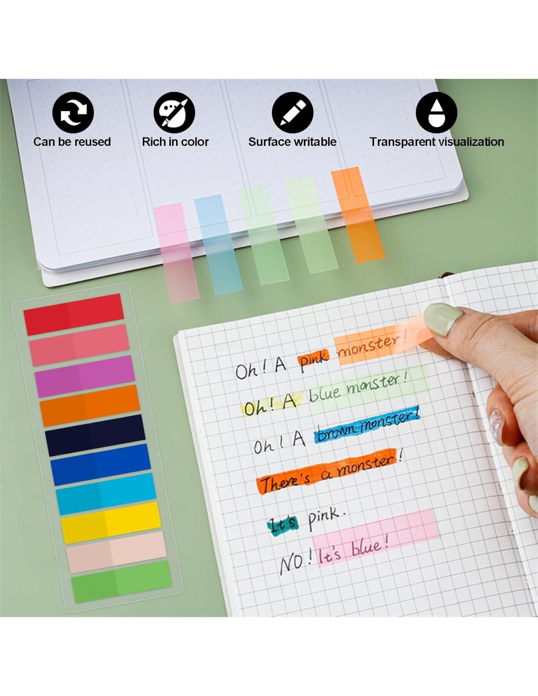 - [Calidad Premium] Fabricadas con material PE de alta calidad, las Pestañas Adhesivas de Anotación están diseñadas para durar. Ofrecen excelentes propiedades adhesivas, asegurando que se mantengan en su lugar cuando las necesites. Además, estas pestañas adhesivas se pueden quitar y reposicionar fácilmente sin dejar residuos, por lo que no tienes que preocuparte por dañar tus libros, documentos u otras superficies. ¡Di adiós a los residuos pegajosos y hola a la organización sin complicaciones!