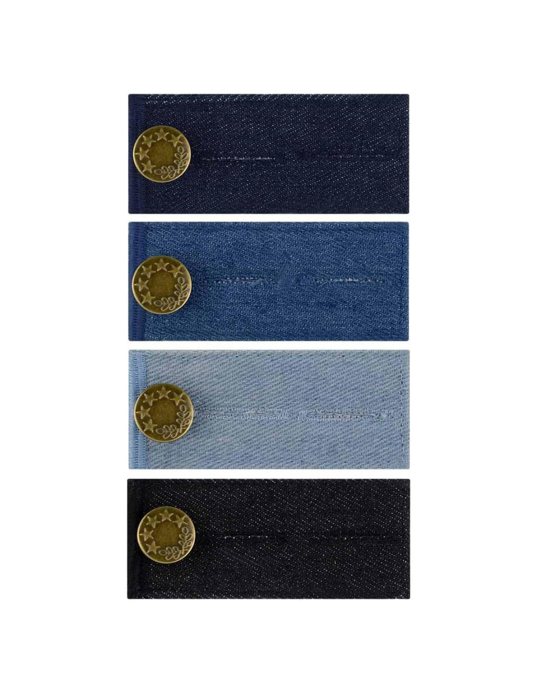 - [Lo Que Recibirás] Cada paquete viene con 4 pcs botones extensores de cintura en 4 tipos de colores diferentes (azul claro, azul, azul oscuro, negro), que es suficiente para tu uso diario. Hemos seleccionado los cuatro tonos de mezclilla más comunes para estos extensores de botón, lo que es conveniente para que los combines con pantalones y faldas de mezclilla