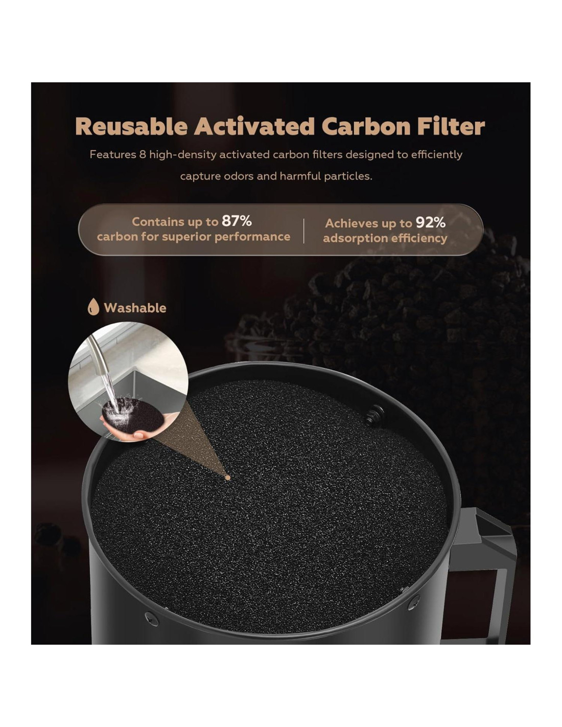 - Filtración de Alta Eficiencia: Nuestro ventilador extractor portátil cuenta con 8 filtros de carbón activado reutilizables (5 mm de grosor cada uno), con una capacidad de filtración verificada en laboratorio de 700 horas (12 meses con uso diario de 2 horas) y tasa de captura de grasa >92%